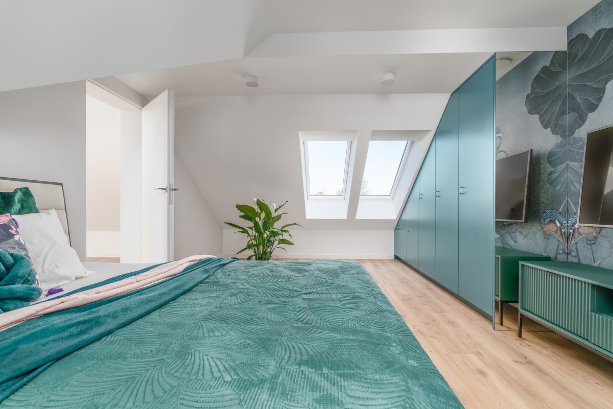 Na poddaszu znajdują się 2 pokoje o powierzchni ponad 20 m² oraz dodatkowa przestrzeń zaaranżowana na kolejny pokój.