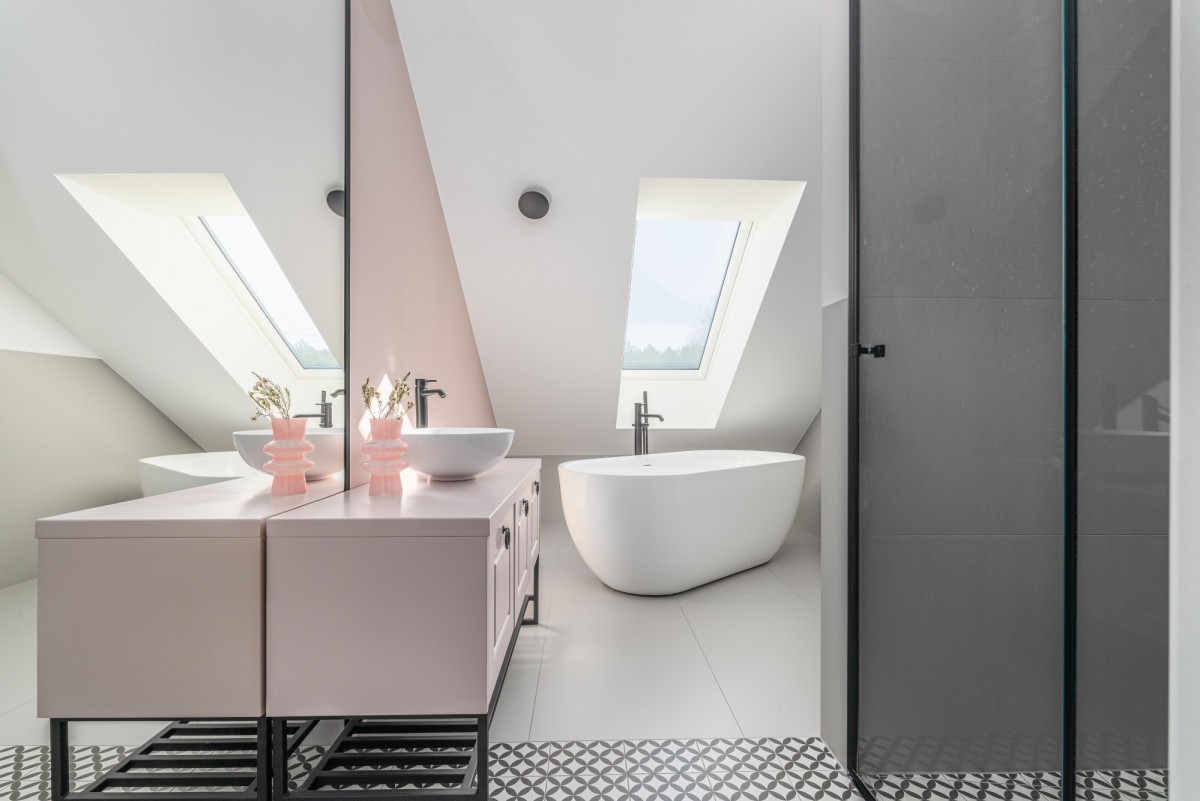 Wnętrze parteru budynku podzielono funkcjonalnie na trzy części. Dzięki adaptacji poddasza uzyskano dodatkową przestrzeń użytkową.