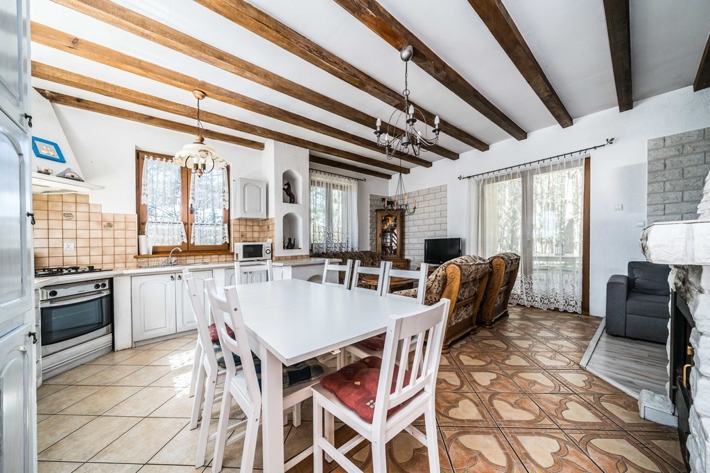 - kuchnia otwarta w zabudowie, połączona z salonem z kominkiem