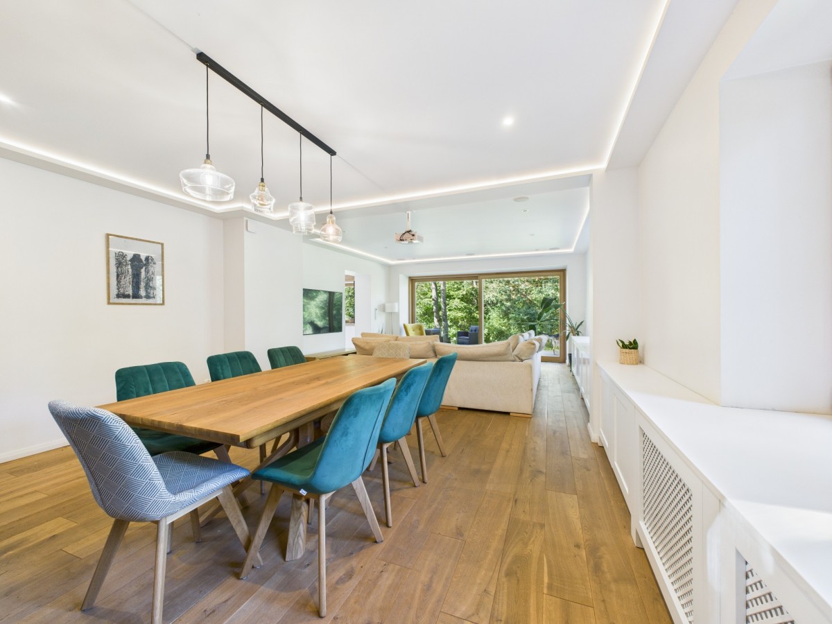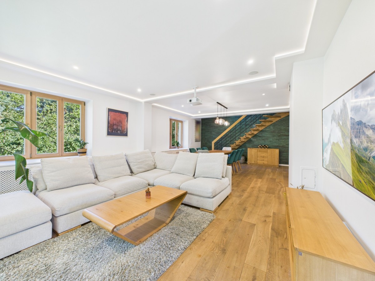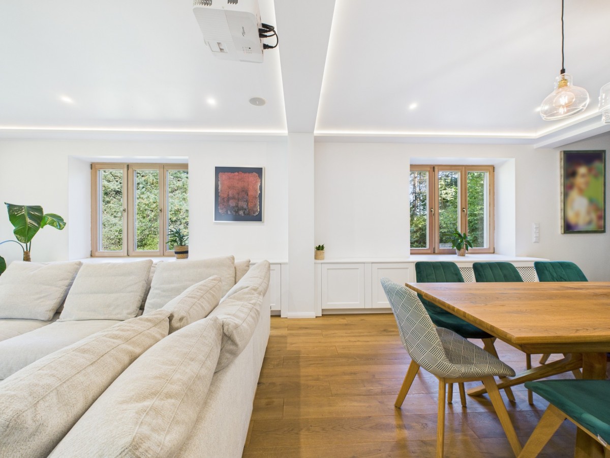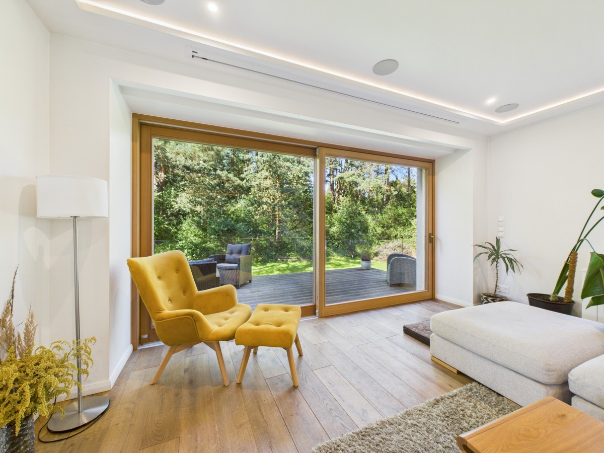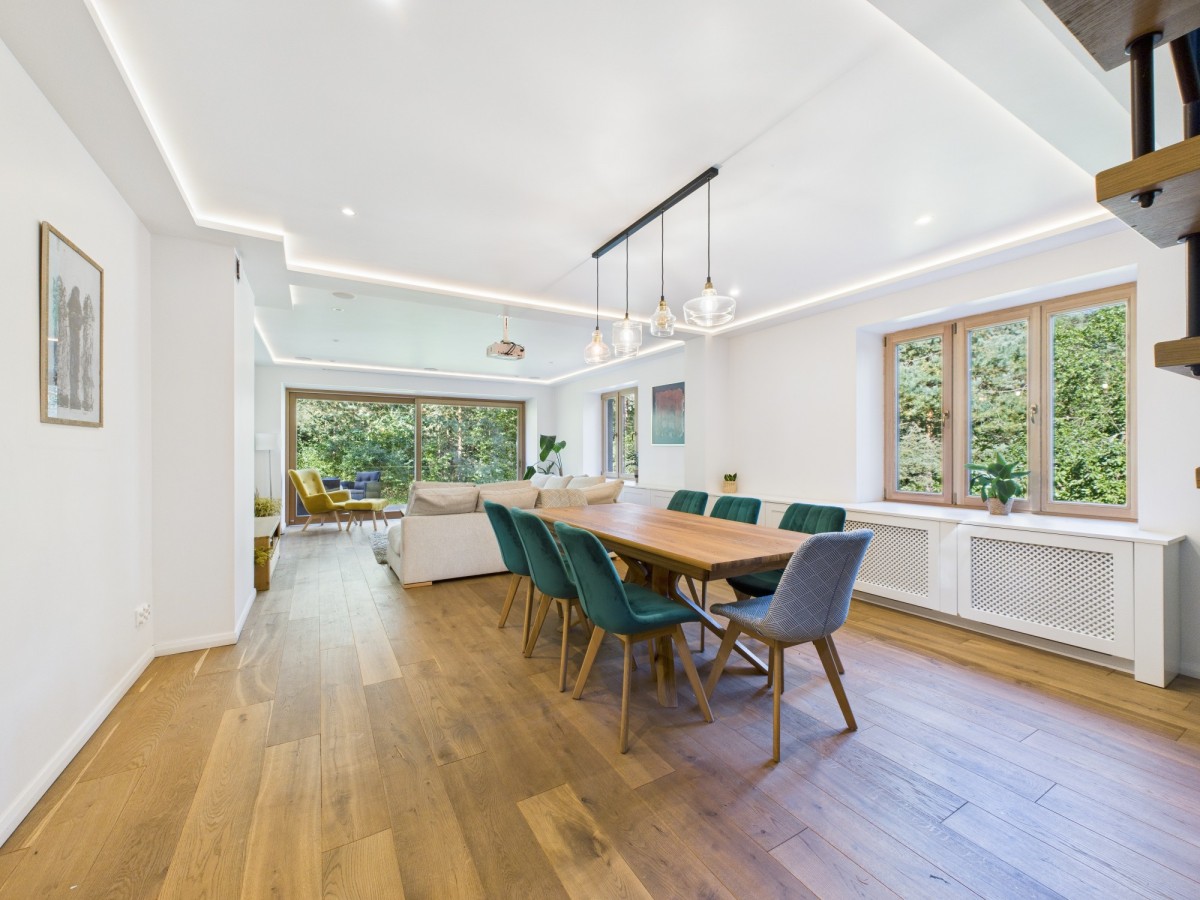 - salon z jadalnią i wyjściem na taras; panoramiczne okna z widokiem na las