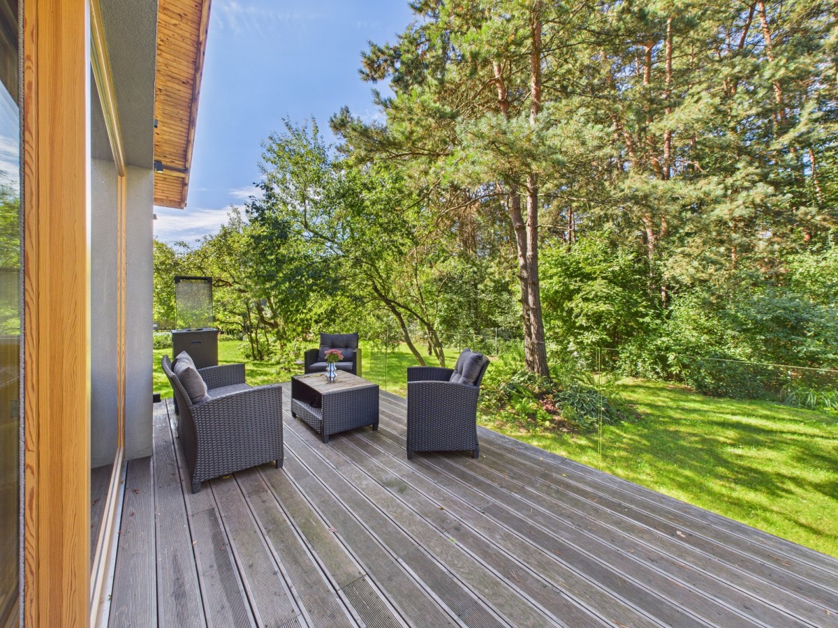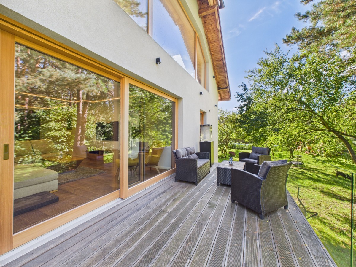 Dom przy lesie- widok na las, taras i ogród z sadkiem