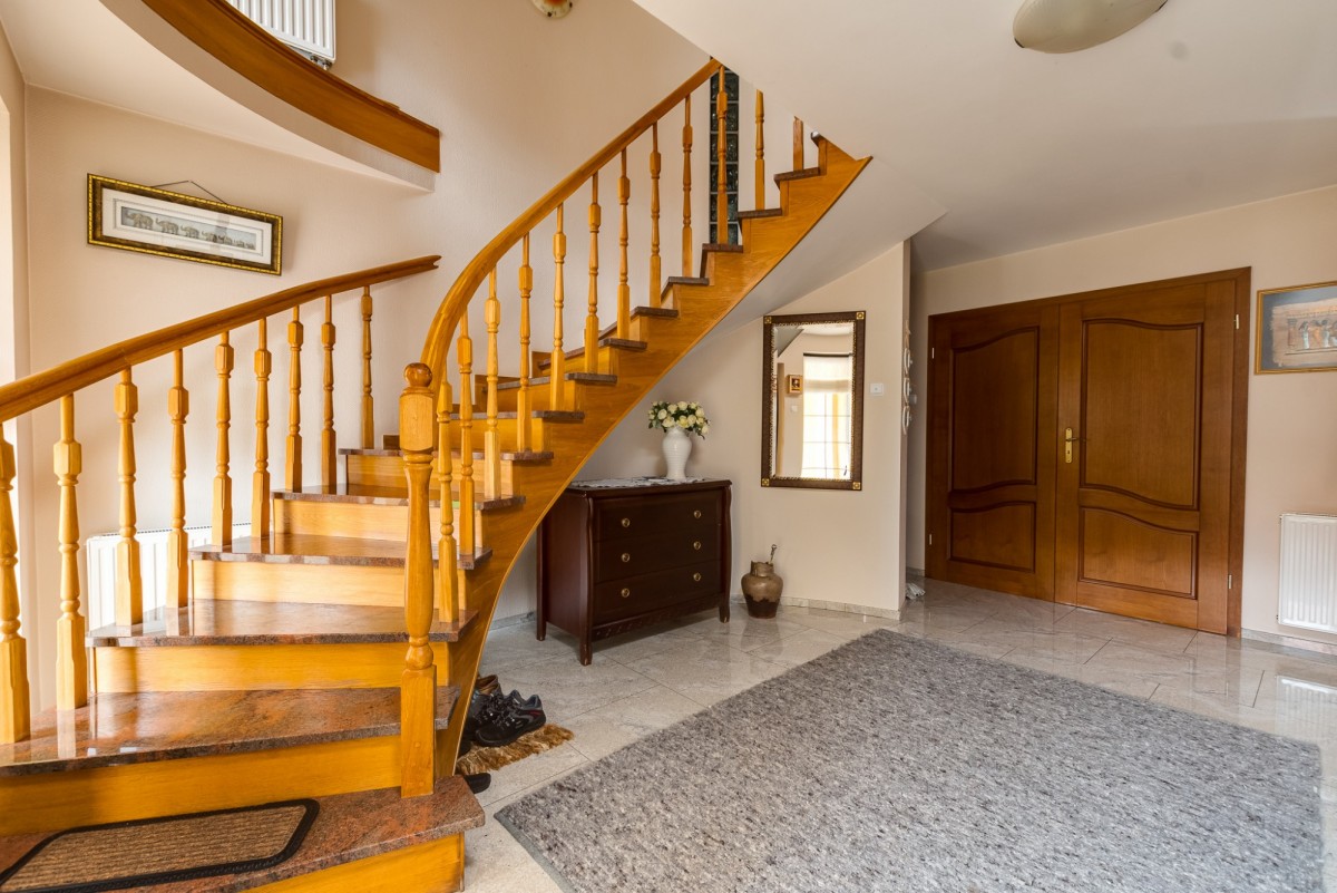 Dom został wykończony i zamieszkały pod koniec 2005 roku. Wykończony z wyjątkową dbałością o jakość i funkcjonalność. Grube ściany konstrukcyjne oraz solidne materiały gwarantują doskonałą izolację termiczną, dzięki czemu budynek jest ciepły i energooszczędny. Wnętrza utrzymane są w klasycznym, ponadczasowym stylu - dębowe schody i balustrady, drewniane parkiety, świetnie rozmieszczone okna, które wpuszczają do środka naturalne światło i pozwalają podziwiać zieleń oraz jezioro.