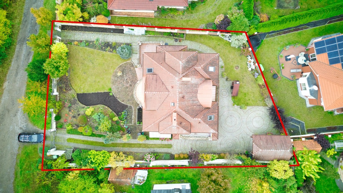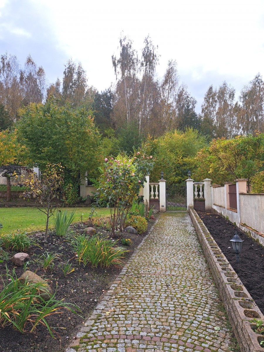 Działka o powierzchni 1004 m² została w pełni zagospodarowana i zachwyca zadbanym ogrodem z roślinnością ozdobną, warzywnikiem oraz trawnikiem. W części rekreacyjnej znajduje się taras, wędzarnia oraz wiata na samochód i opał. Podjazd oraz dojścia do budynku wykonano z kostki brukowej. Nieruchomość otacza murowane ogrodzenie z dekoracyjnymi elementami i automatyczną bramą.