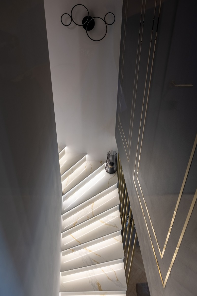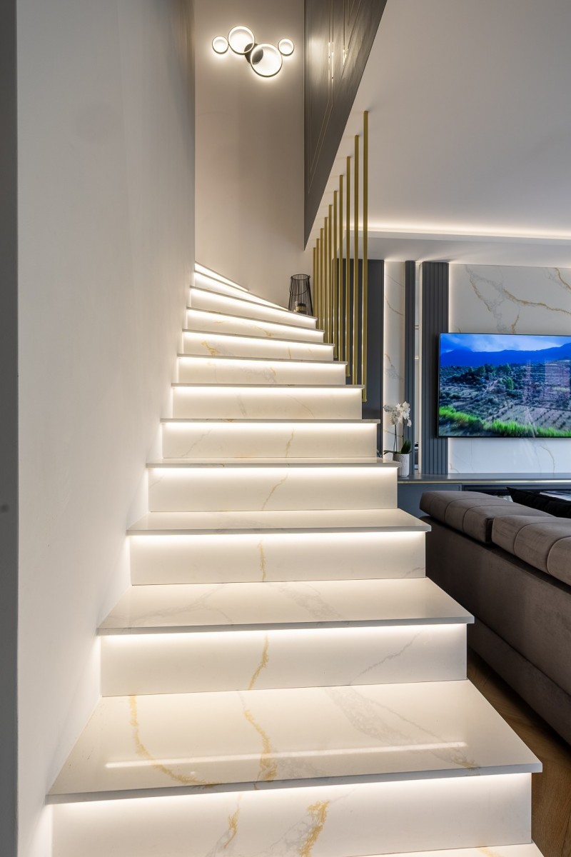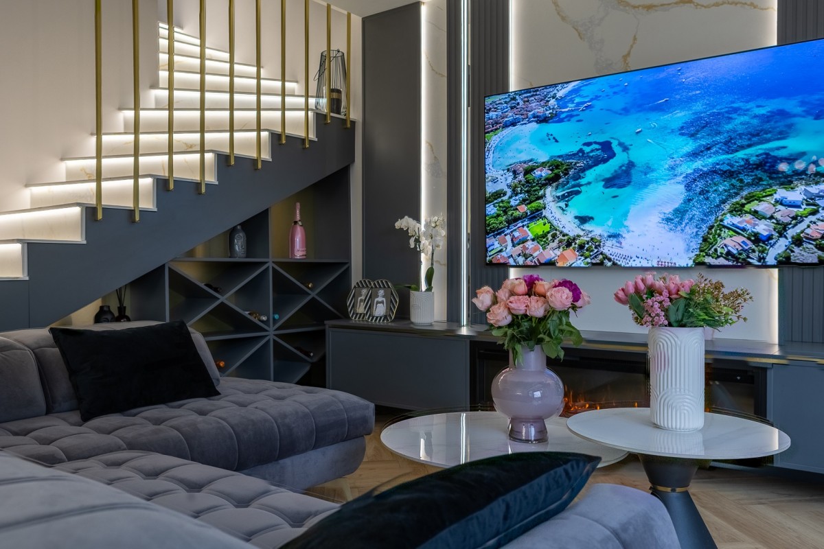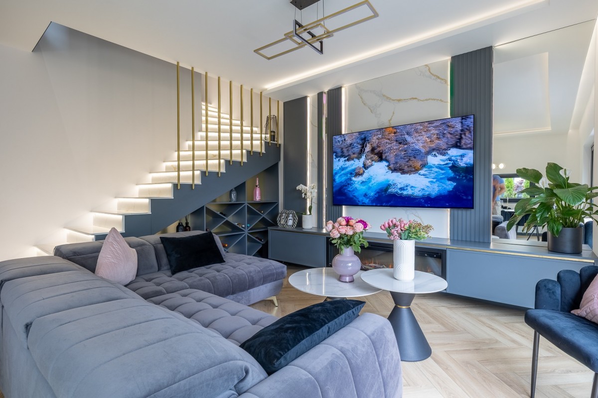 ponad 35,00 m² pokoju dziennego z jadalnią z bezpośrednim wyjściem na taras - idealne miejsce na rodzinne spotkania i przyjęcia. Wykończona naturalnym kamieniem ściana RTV idealnie komponuje się z podświetlanymi kamiennymi schodami.