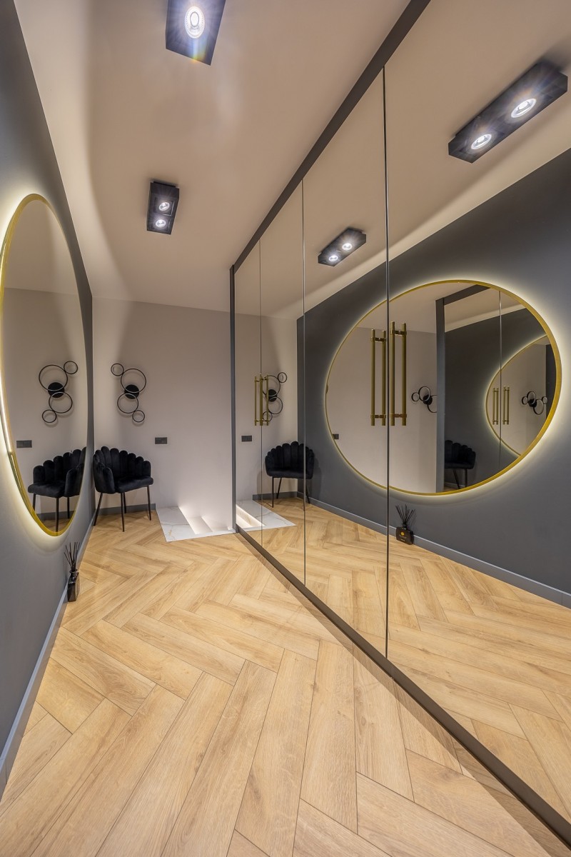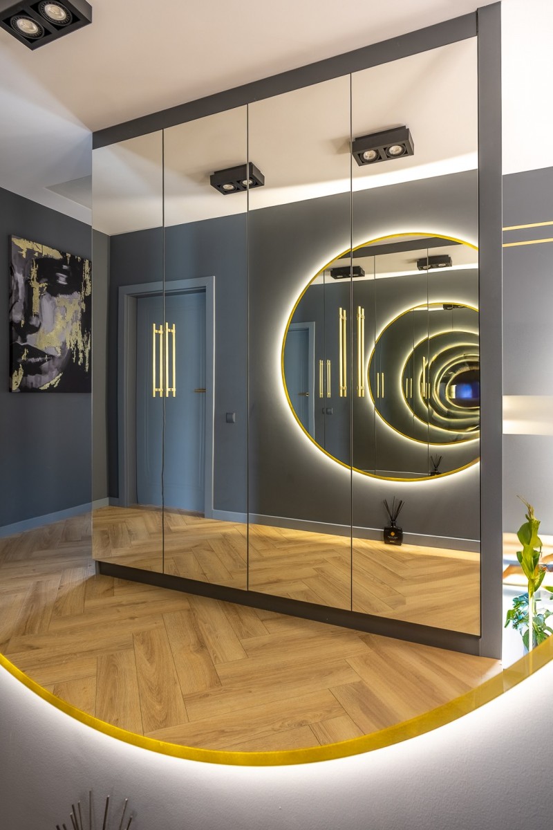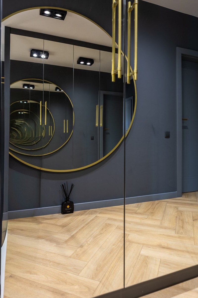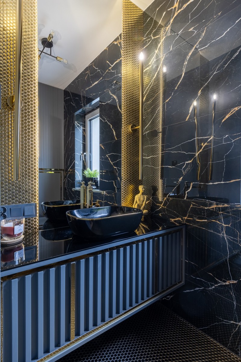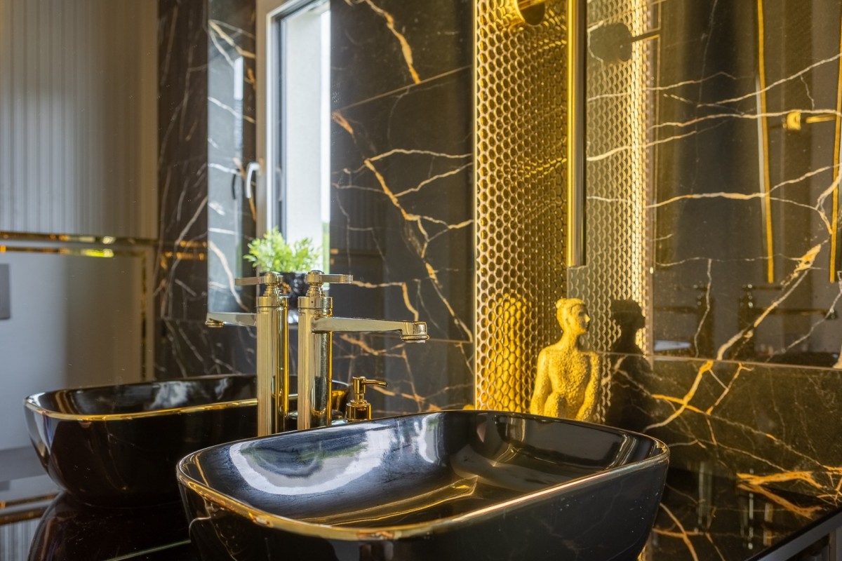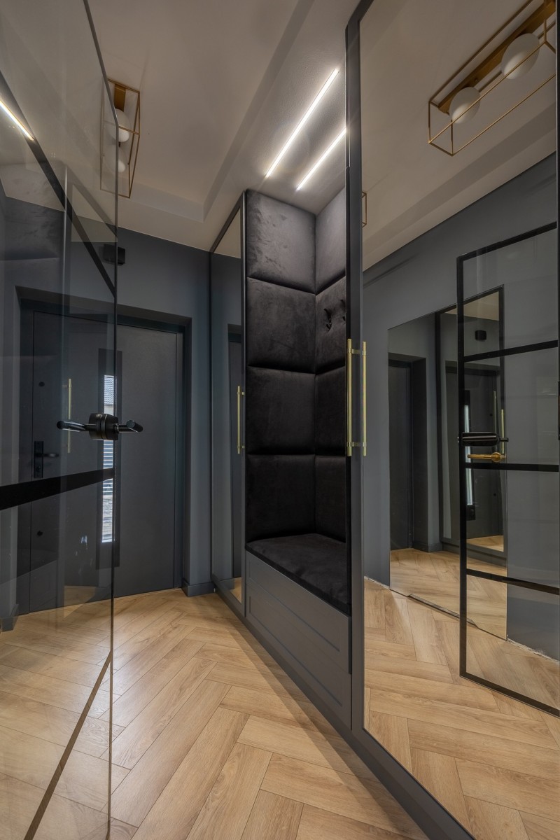 Wyrafinowana sypialnia - wykończona w czerni i złocie z dużą oszkloną szafą,