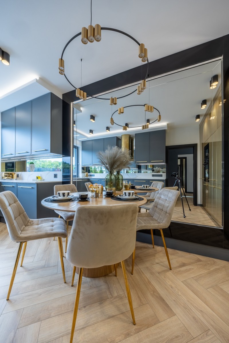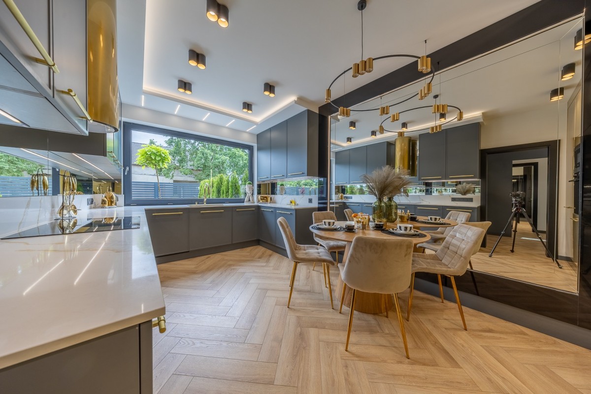 Stylowa kuchnia: Przestronna, z dużym oknem, doskonale doświetlona i wyposażona w najnowszy sprzęt oraz zabudowę kuchenną, stanowiąca serce domu. Jej nieprzeciętny design z pewnością zachwyci każdego miłośnika gotowania.