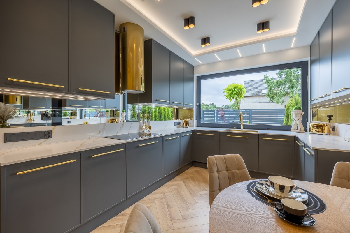 Kuchnia o powierzchni ponad 17,00 m² - elegancka, funkcjonalna i pełna naturalnego światła, z dużym kamiennym blatem roboczym,
