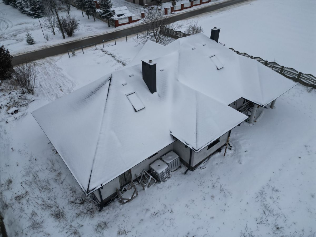 Dom wybudowany z bloczków silikatowych (N18 - ściany nośne, N12 - działowe), solidnie ocieplony 18 cm grafitowego styropianu AUSTROTHERM. Fundamenty i strop żelbetowe, dach o konstrukcji krokwiowej, ocieplony wełną mineralną i pokryty gontem bitumicznym. Budynek przygotowany do wykonania tynku zewnętrznego. Okna PCV, trzyszybowe, parapety zewnętrzne w kolorze antracyt.