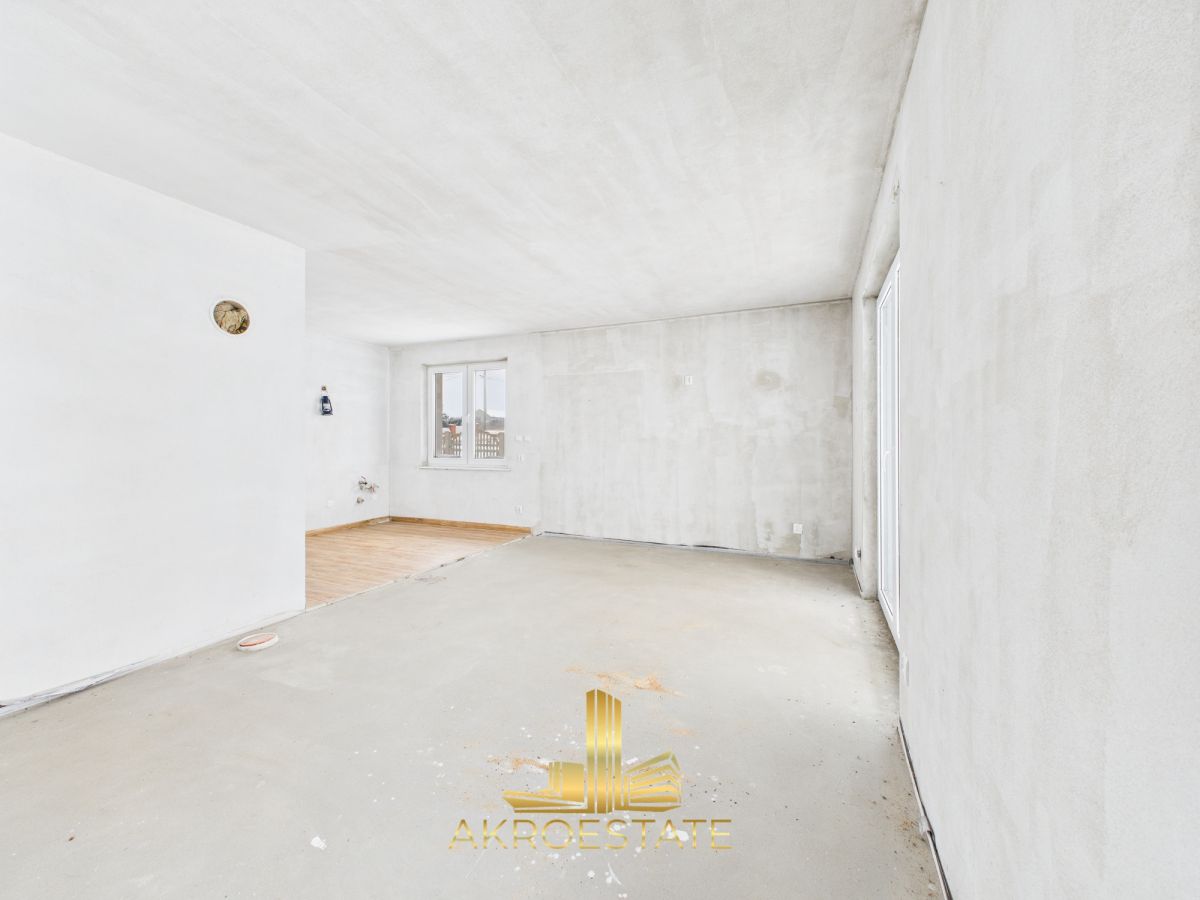 Na parterze znajduje się przestronny salon z otwartą kuchnią (37 m²) z miejscem na kominek oraz wyjściem na taras i ogród, trzy pokoje, dwie łazienki, wiatrołap, komunikacja oraz garaż o powierzchni 52 m². Część pomieszczeń jest wykończona, pozostałe do indywidualnej aranżacji. Poddasze do adaptacji o powierzchni 61 m² (wysokość powyżej 1,9 m).