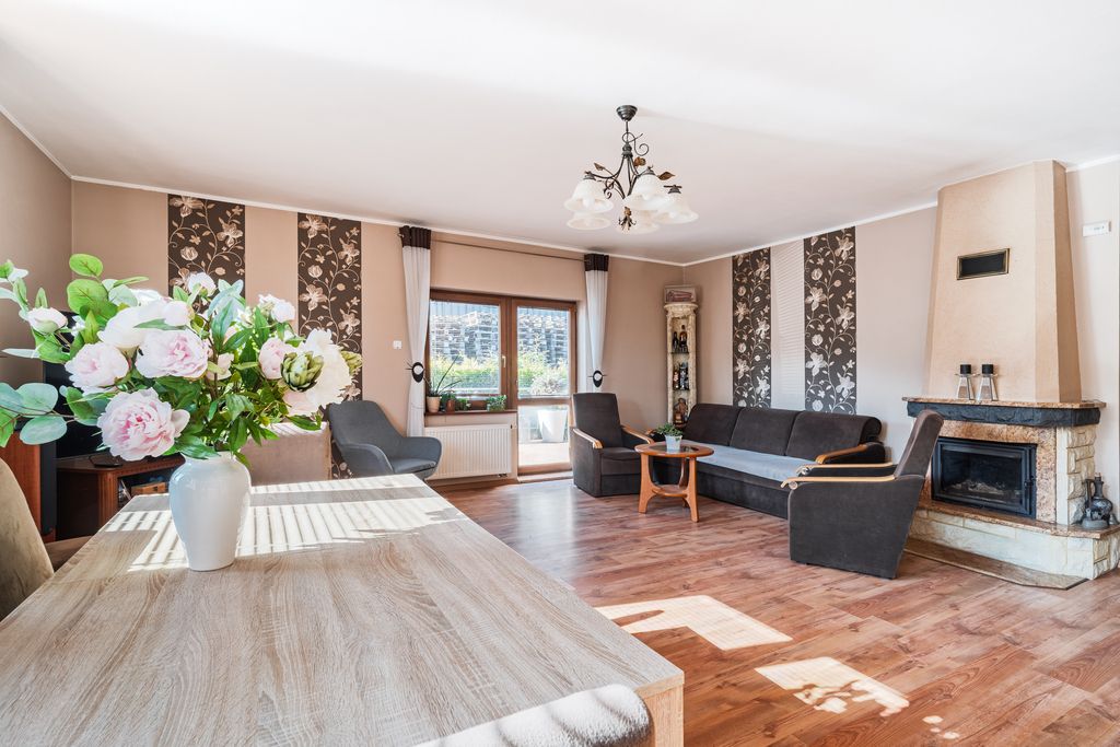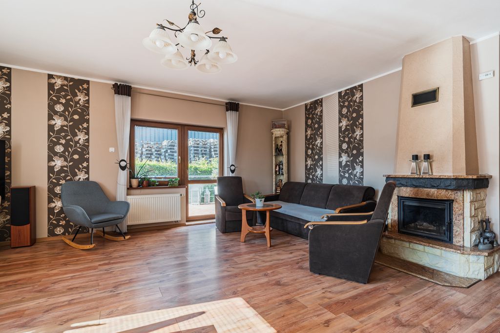 - przestronny salon z kominkiem i wyjściem na taras