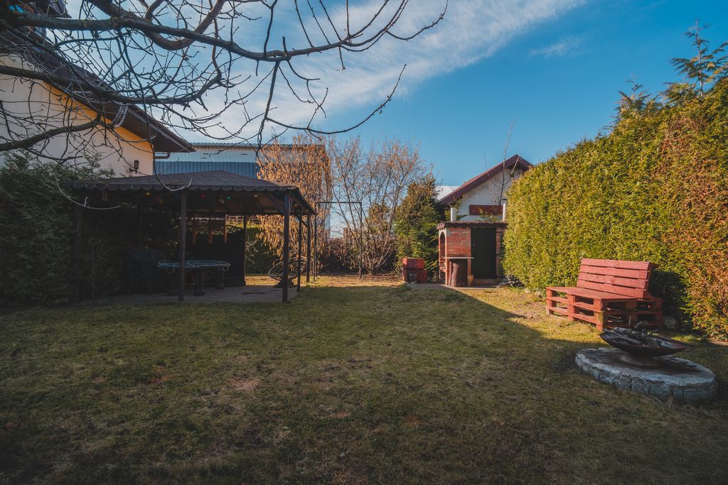 - Działka: 628 m² – zadbany ogród z drzewami owocowymi (czereśnie, brzoskwinia, jabłoń, orzech laskowy) z murowanym grillem, domkiem gospodarczym, wiatą, miejscem na ognisko, drewutnią