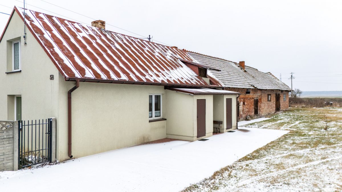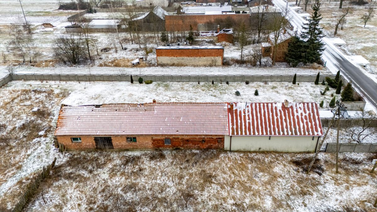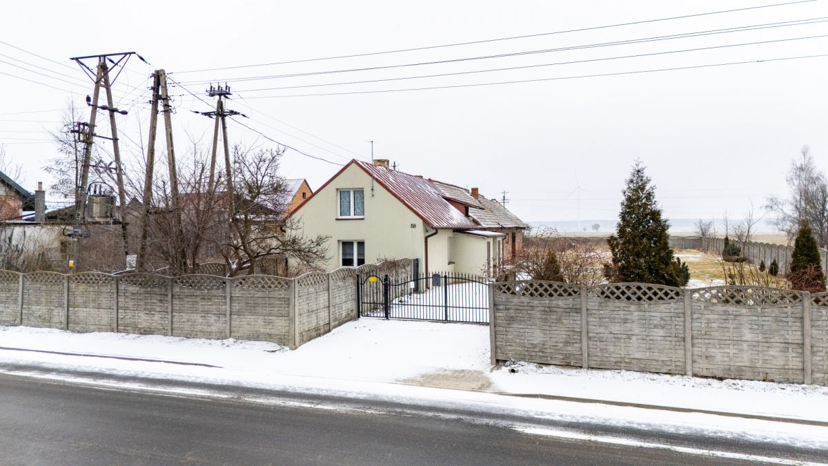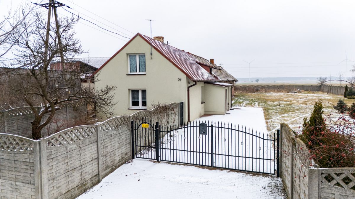 Nieruchomość posiada dwa niezależne wejścia prowadzące do odrębnych części mieszkalnych. Pierwsze wejście prowadzi do kuchni połączonej z salonem, z której przechodzi się do pokoju oraz bezpośrednio do łazienki. Drugie, osobne wejście prowadzi do dużego pokoju z aneksem kuchennym, w którym znajduje się kominek pełniący obecnie funkcję jedynego źródła ogrzewania. Do obu części prowadzą oddzielne wiatrołapy, co zwiększa komfort użytkowania. Wysokość pomieszczeń wynosi około 2,30 m. Dom posiada również poddasze, które obecnie nie jest zagospodarowane, jednak może zostać zaadaptowane według własnej koncepcji. Dach pokryty jest blacho dachówką. Do części mieszkalnej przylegają budynki gospodarcze przeznaczone do przebudowy lub rozbiórki, co daje możliwość uporządkowania i nowej aranżacji całej zabudowy siedliskowej.