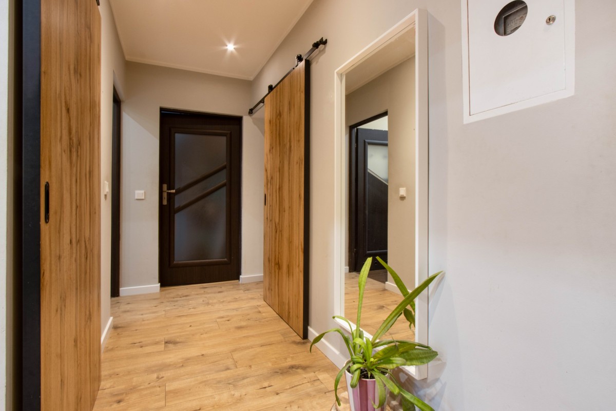 Wnętrza: Zachowana oryginalna klatka schodowa z drewnianymi stopniami i stylową balustradą, oddająca ducha lat 30. XX wieku.