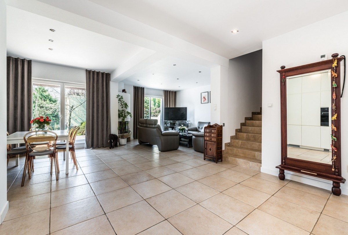 - na parterze salon z jadalnią (ok. 33 m2, z salonu wyjście na taras), otwarta kuchnia, WC, hol z obszernymi szafami w zabudowie;