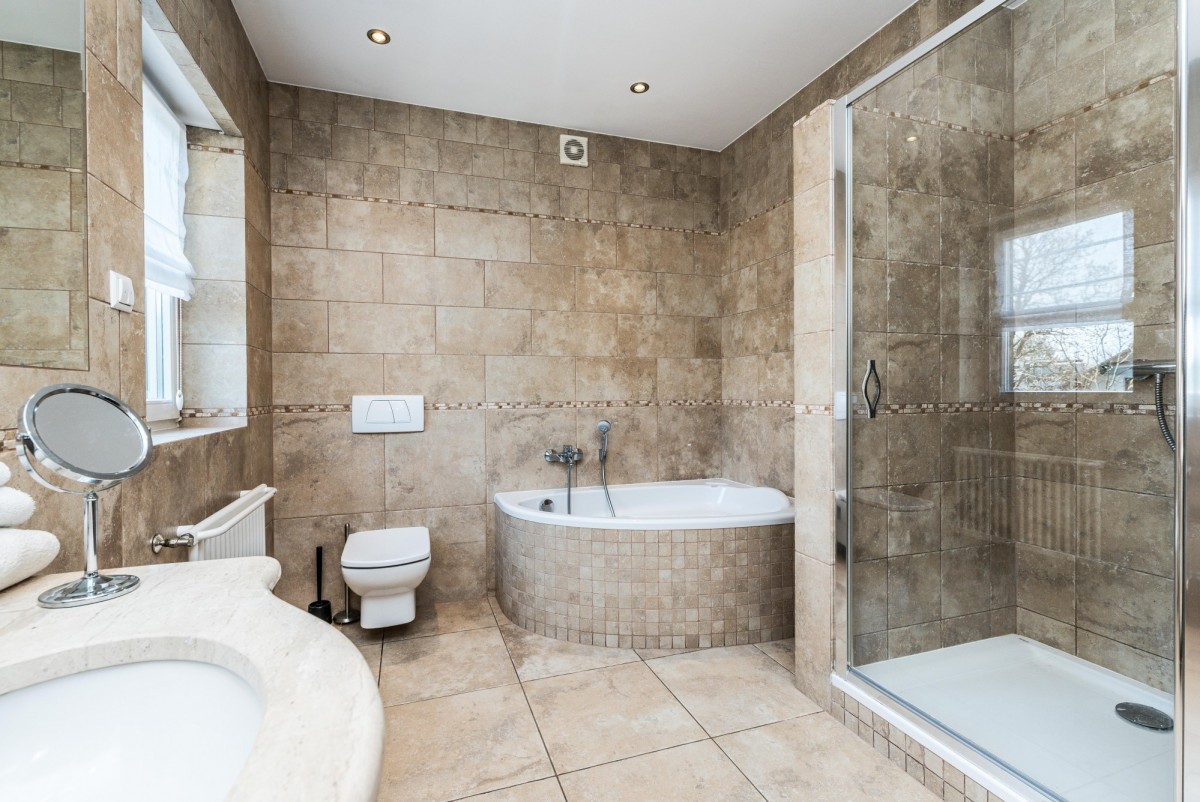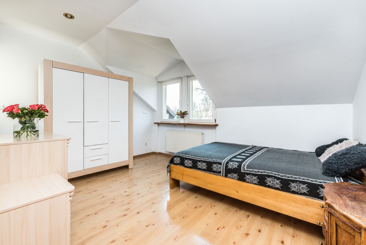 - na piętrze 3 sypialnie (17, 14, 8 m2), wchodzona garderoba (ok. 5 m2, z wejściem na strych), duża łazienka (ok. 8,5 m2) z kabiną i wanną;