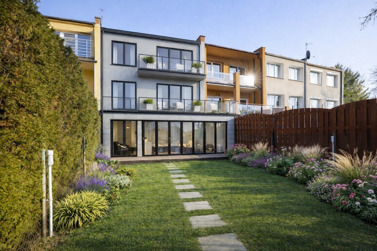 Dom szeregowy posadowiony jest na działce o powierzchni 275 m², z ogrodem znajdującym się w tylnej części posesji. Powierzchnia użytkowa budynku wynosi 212,9 m², co daje bardzo komfortowe warunki do życia nawet dla większej rodziny.