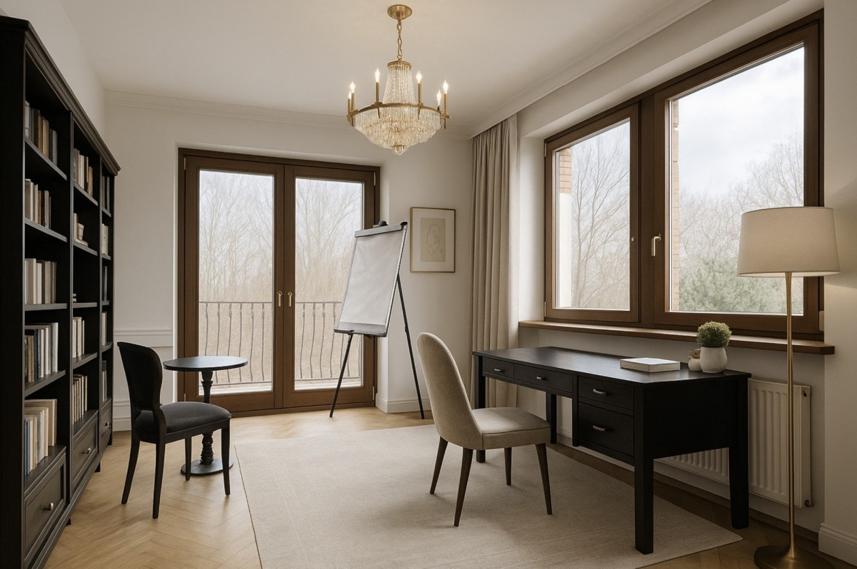 Pokój telewizyjny (10 m²): może posłużyć jako dodatkowy gabinet albo sypialnia gościnna.