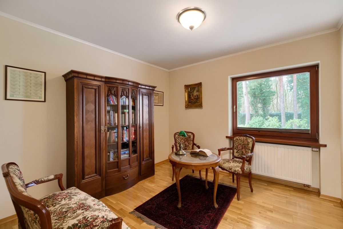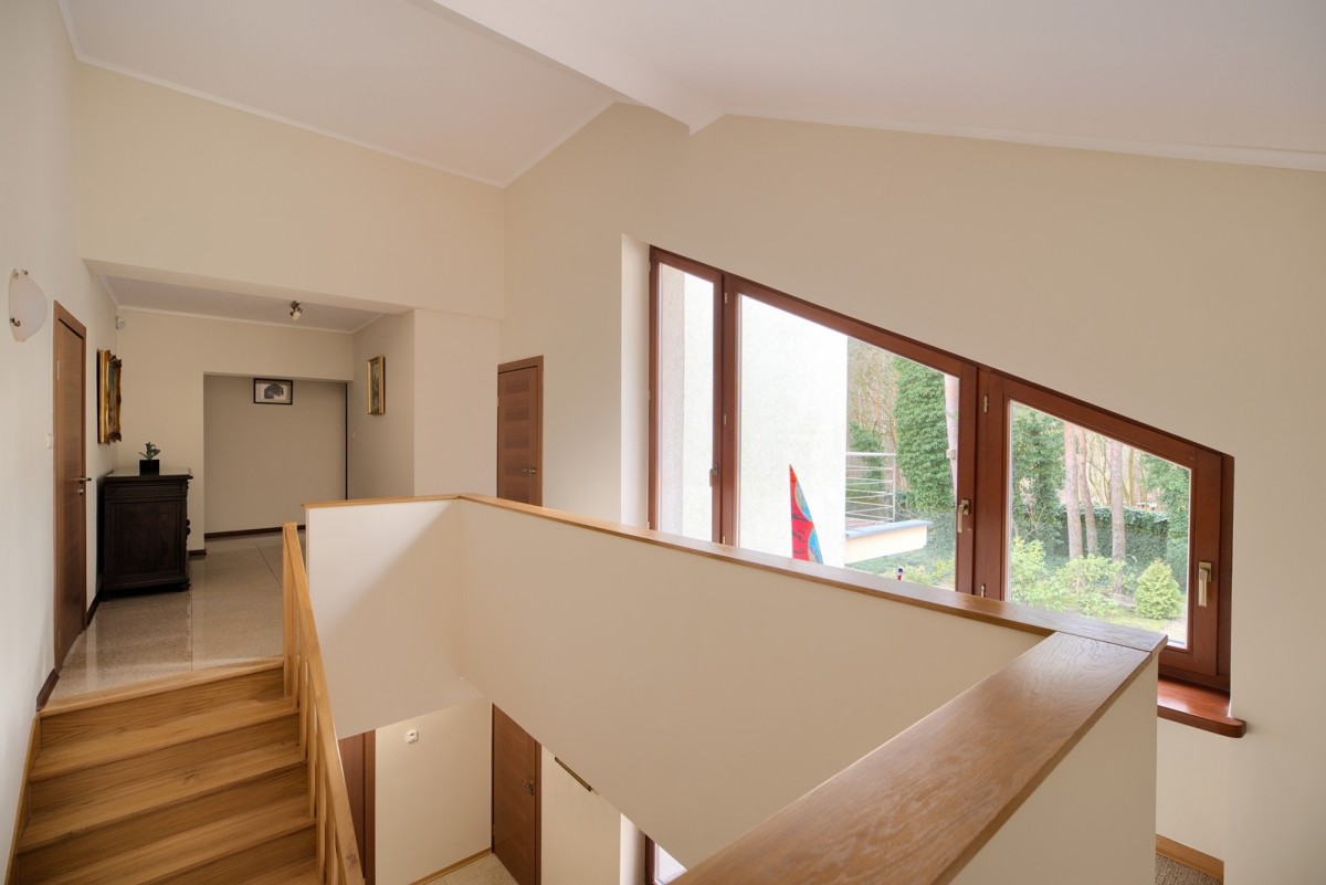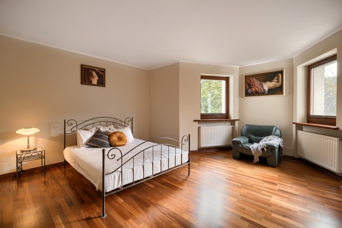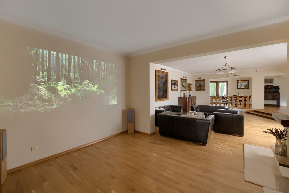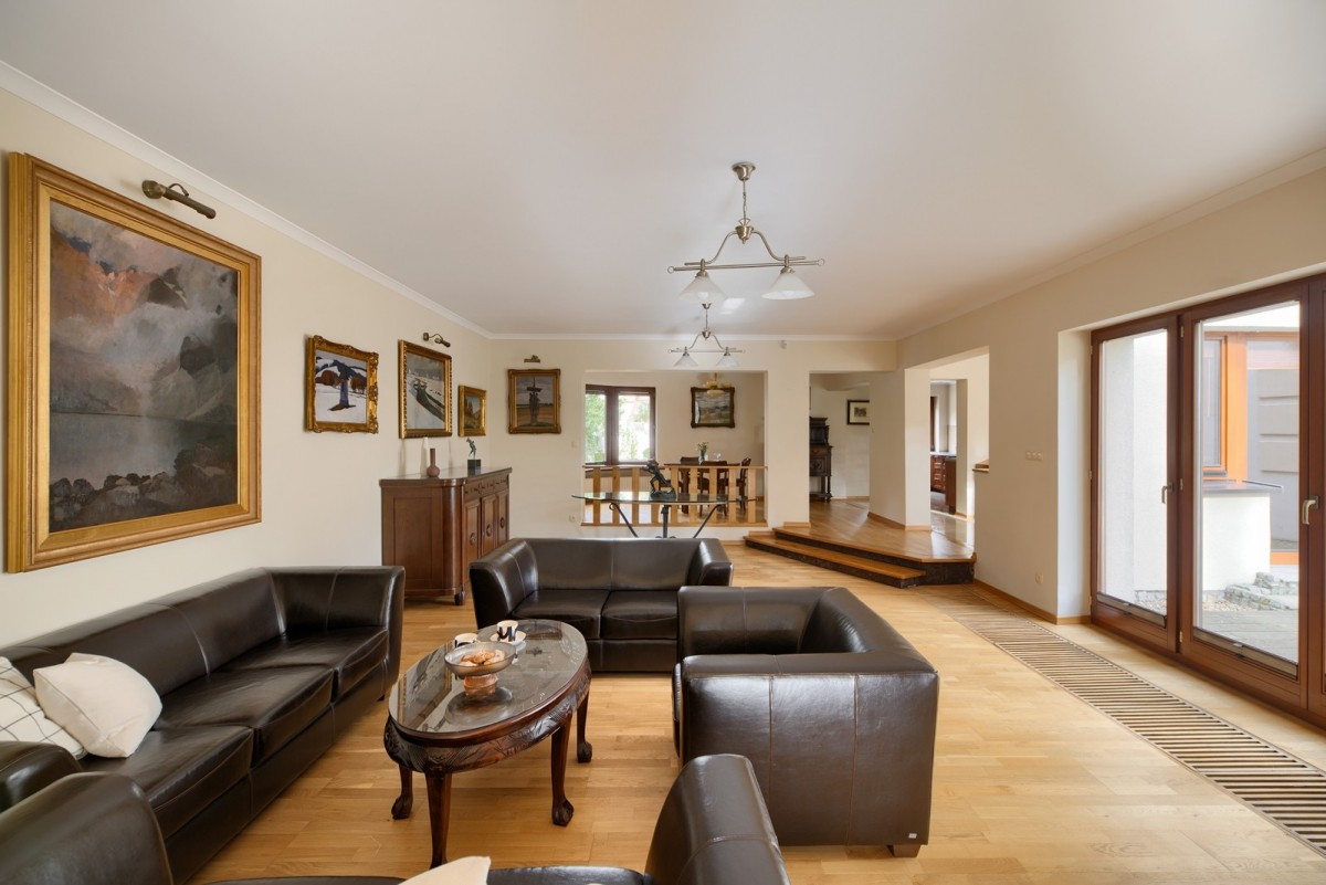 Przestronny salon został podzielony na część dzienną oraz część kinową z zainstalowanym rzutnikiem, obie części zostały oddzielone od siebie dwustronnym kominkiem. Drewniana kuchnia na wymiar, wyposażona w wysokiej jakości sprzęt AGD w zabudowie oraz granitowe blaty. Na piętrze znajdują się cztery ustawne sypialnie oraz łazienka. Główna sypialnia posiada dostęp do dodatkowej łazienki en suite oraz garderoby. W piwnicy, poza pomieszczeniami gospodarczymi oraz technicznymi, znajduje się wyposażona siłownia oraz piwniczka na wino.
