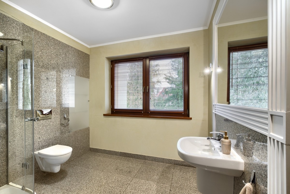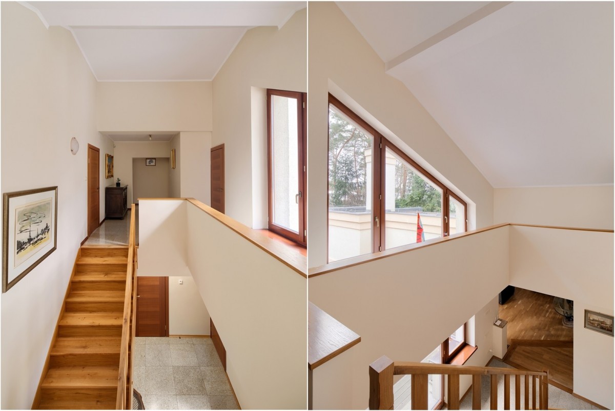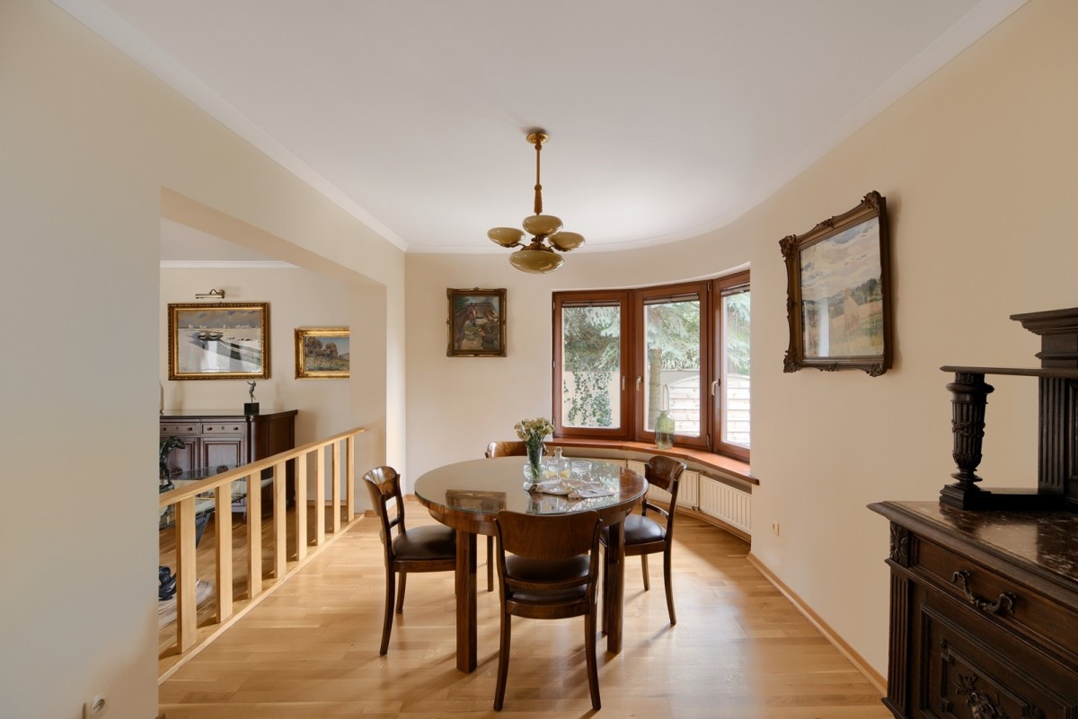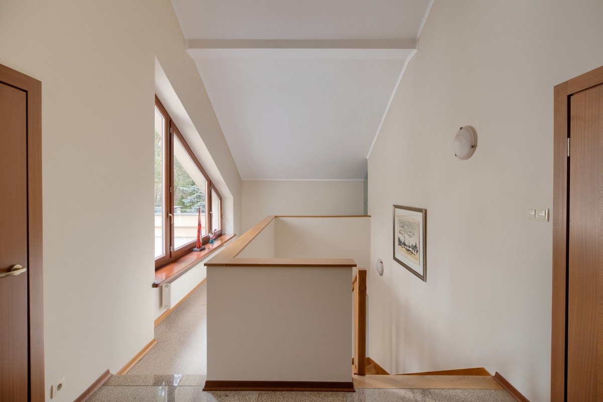 Przestronny salon został podzielony na część dzienną oraz część kinową z zainstalowanym rzutnikiem, obie części zostały oddzielone od siebie dwustronnym kominkiem. Drewniana kuchnia na wymiar, wyposażona w wysokiej jakości sprzęt AGD w zabudowie oraz granitowe blaty. Na piętrze znajdują się cztery ustawne sypialnie oraz łazienka. Główna sypialnia posiada dostęp do dodatkowej łazienki en suite oraz garderoby. W piwnicy, poza pomieszczeniami gospodarczymi oraz technicznymi, znajduje się wyposażona siłownia oraz piwniczka na wino.