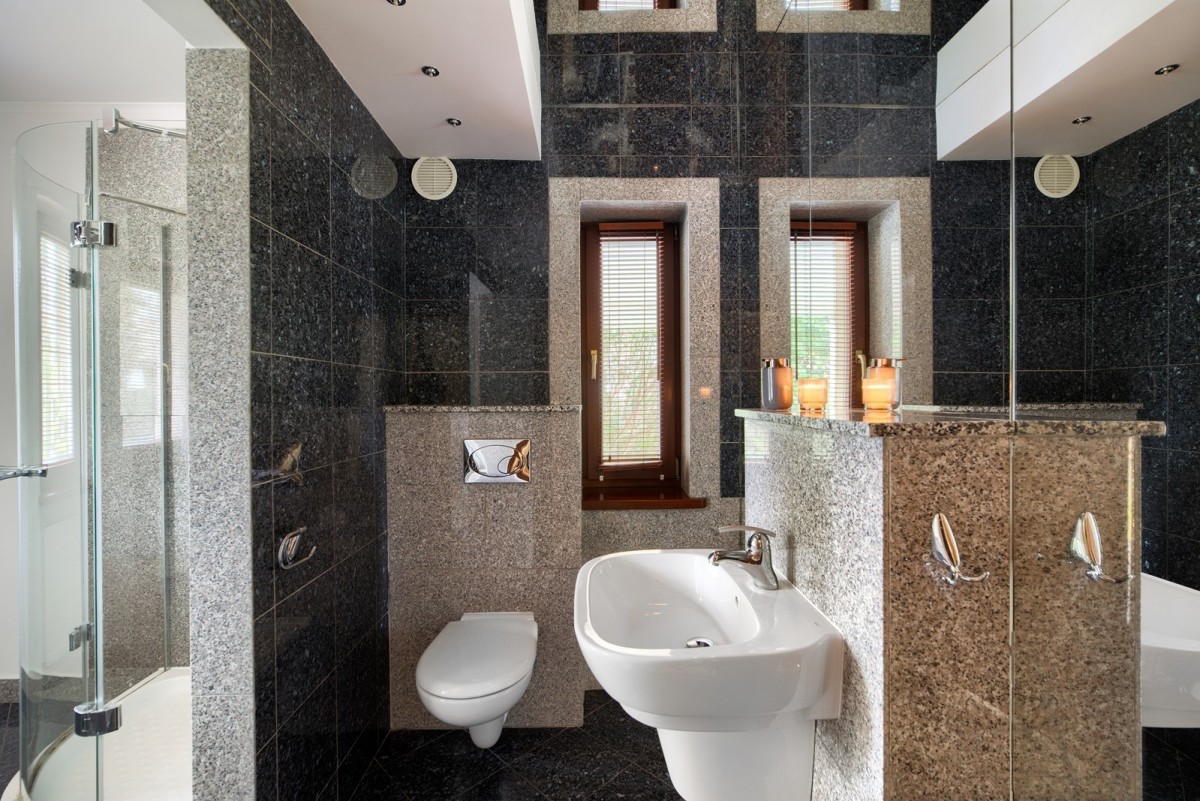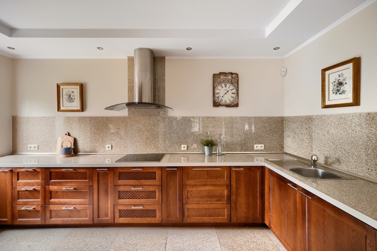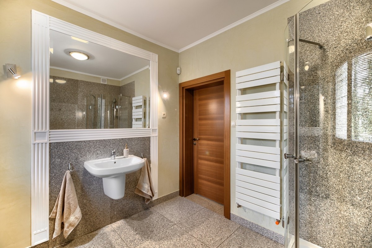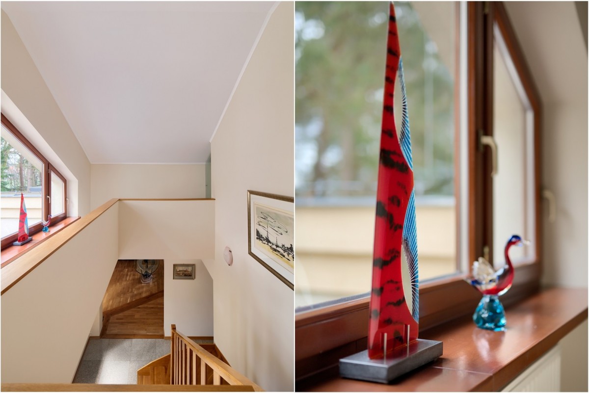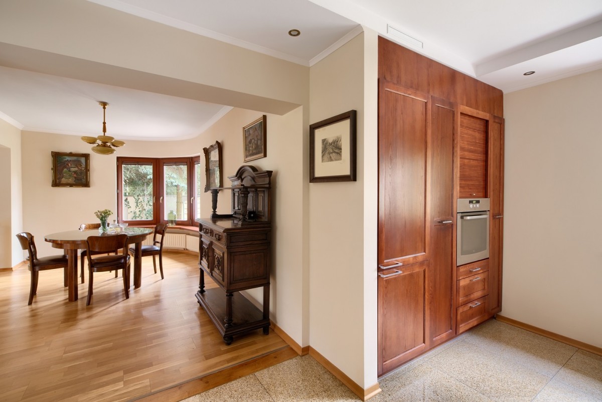 Przestronny salon został podzielony na część dzienną oraz część kinową z zainstalowanym rzutnikiem, obie części zostały oddzielone od siebie dwustronnym kominkiem. Drewniana kuchnia na wymiar, wyposażona w wysokiej jakości sprzęt AGD w zabudowie oraz granitowe blaty. Na piętrze znajdują się cztery ustawne sypialnie oraz łazienka. Główna sypialnia posiada dostęp do dodatkowej łazienki en suite oraz garderoby. W piwnicy, poza pomieszczeniami gospodarczymi oraz technicznymi, znajduje się wyposażona siłownia oraz piwniczka na wino.
