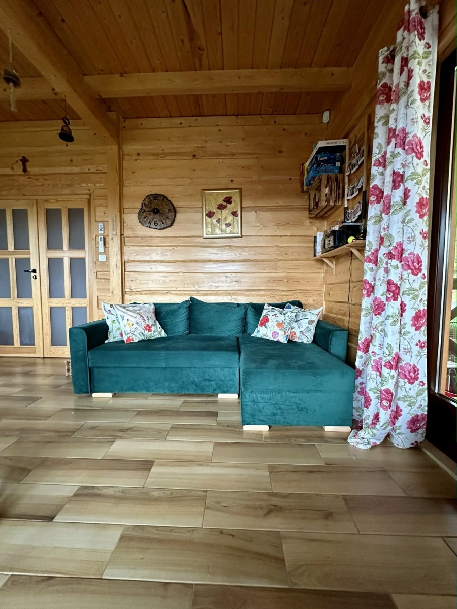 Dom został wykonany z wysokiej jakości drewna i ocieplony wełną mineralną, co gwarantuje doskonałą izolację cieplną. Dach pokryto blachą o nowoczesnym wyglądzie, idealnie współgrającą z drewnianą elewacją.