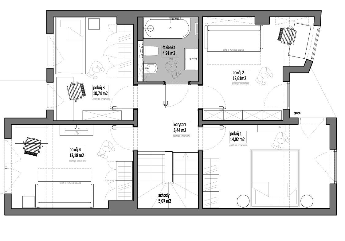 Na piętrze z 2 sypialni jest wyjście na balkon.