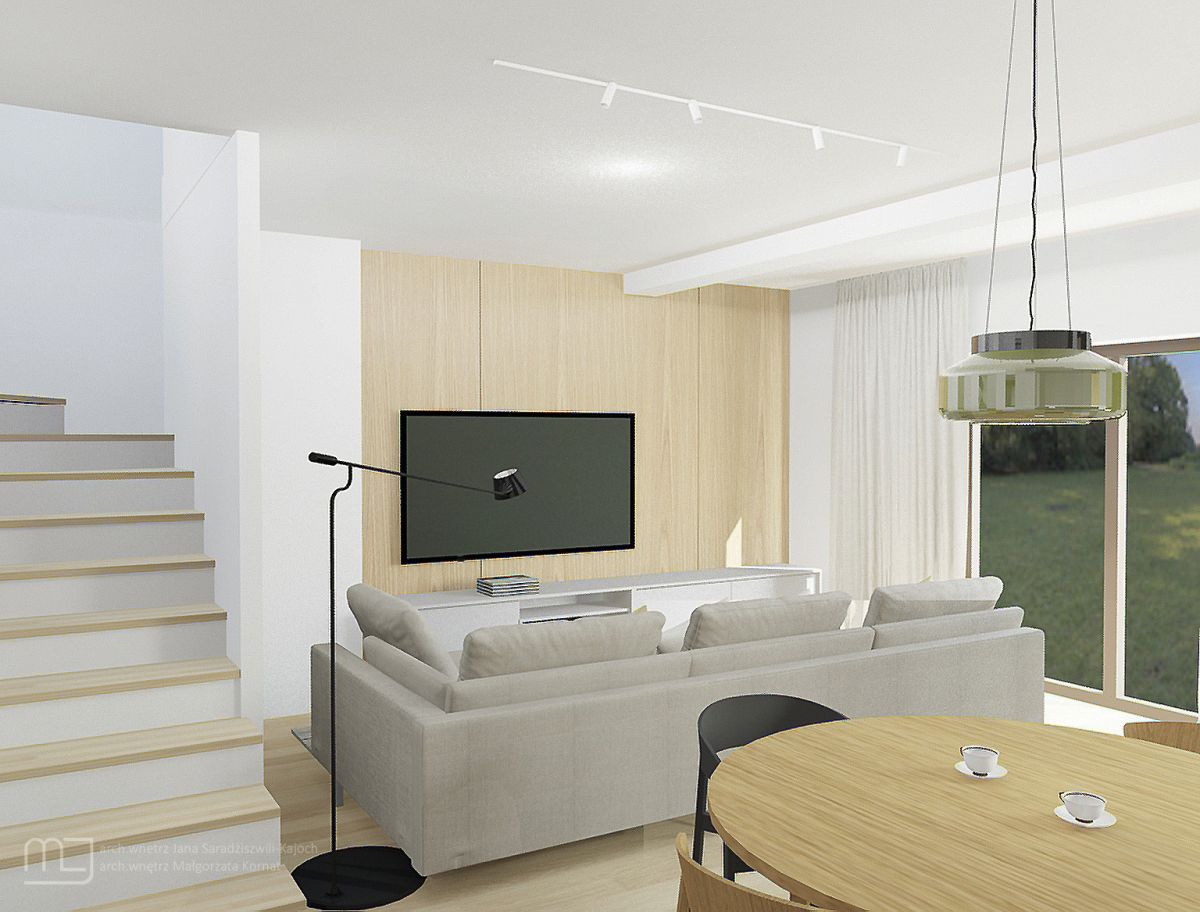 Z pokoju dziennego jest wyjście drzwiami podwójnymi na taras i ogród.