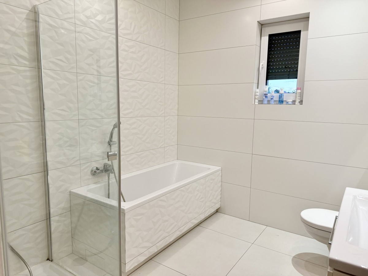 Łazienka: wanna i prysznic, białe, neutralne płytki.