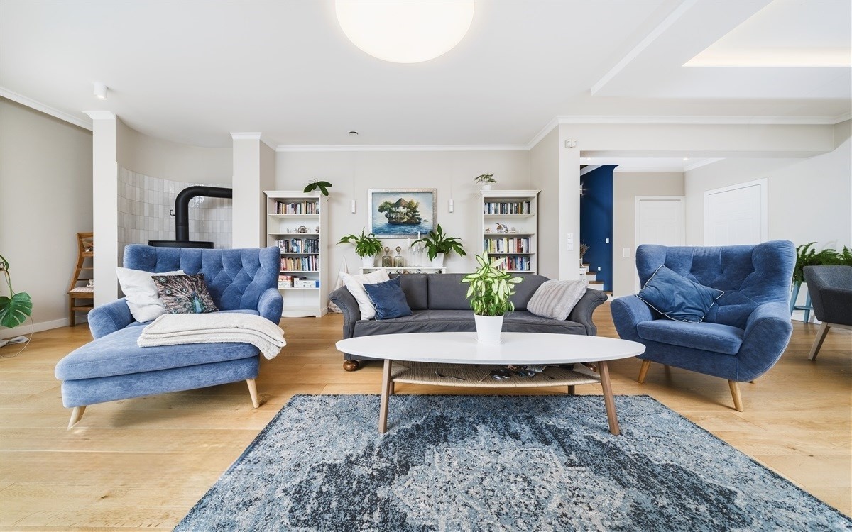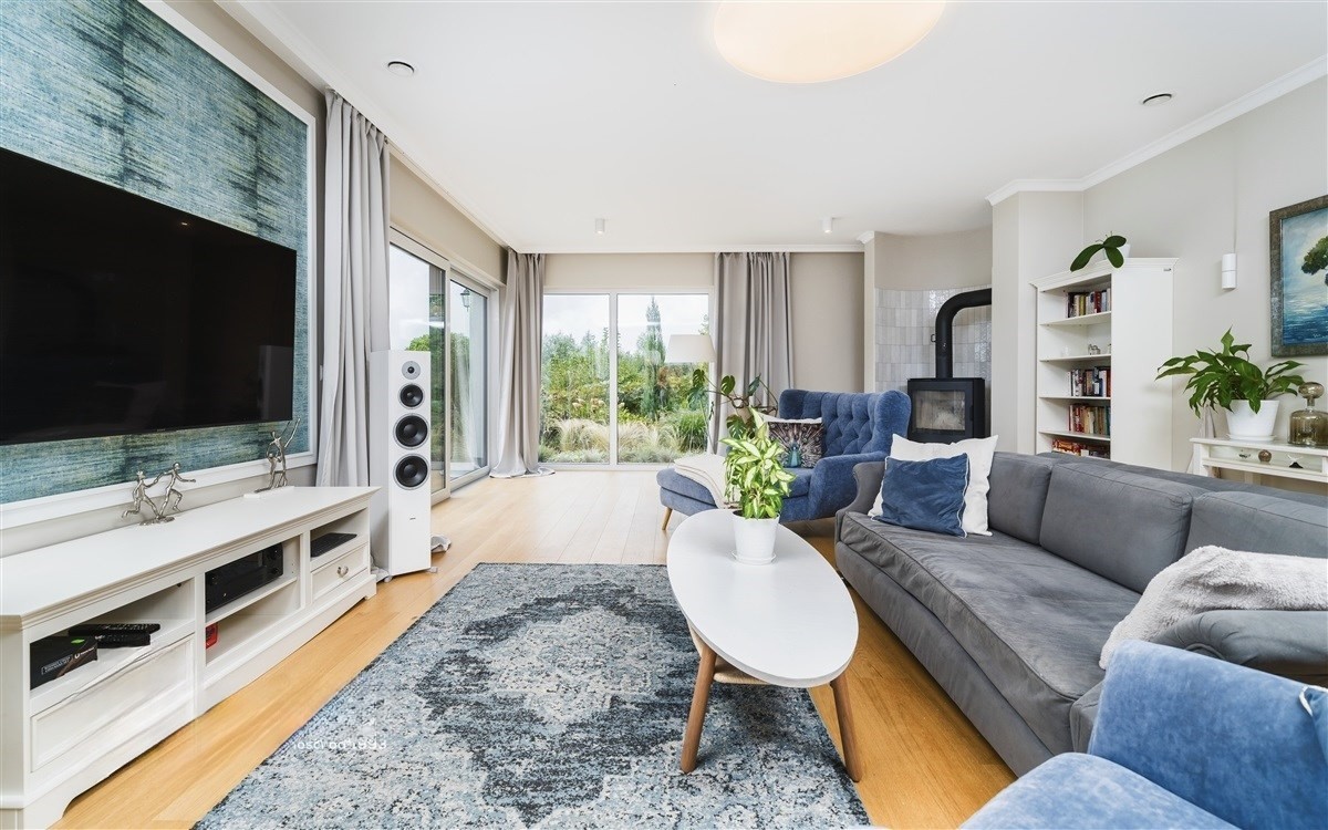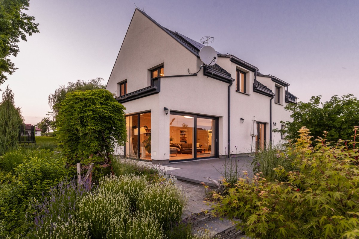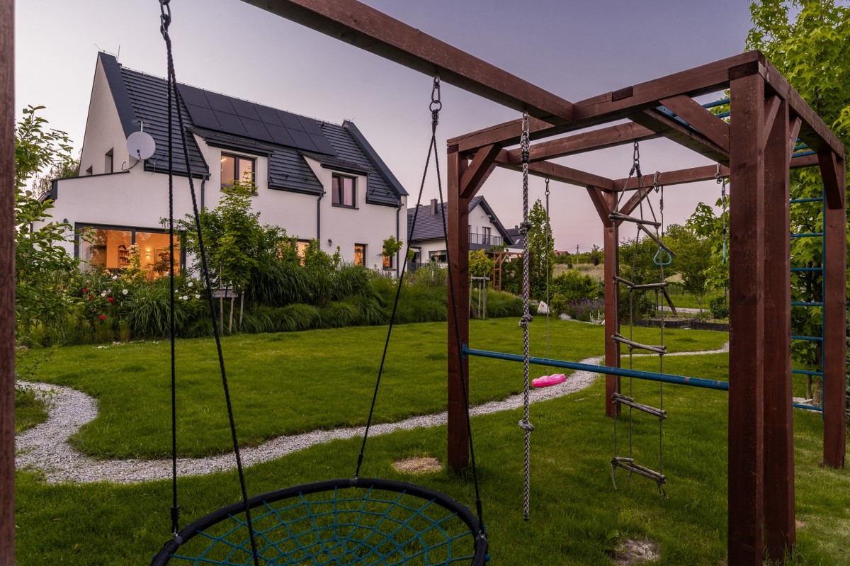 Dom jest niezwykle komfortowy i ma wyjątkową atmosferę luzu i delikatnej elegancji. Ogród, który go otacza kwitnie od wiosny do późnej jesieni w tonacji różu i fioletu oraz bieli ciesząc oko i zapewniając dużo radości. W ogrodzie znajdują się już wyrośnięte i zadomowione rośliny, a jego pielęgnacja nie jest trudna. Poza miejscem na tarasie jest również miejsce z ogniskiem, plac zabaw dla dzieci, podniesione grządki oraz rośliny owocowe. W ogrodzie jest system nawodnienia z elektronicznym programowaniem podzielony na sekcje i dopasowany do potrzeb ogrodu. Poza garażem można zaparkować dodatkowo 4 samochody. Jest również budka śmietnikowa.