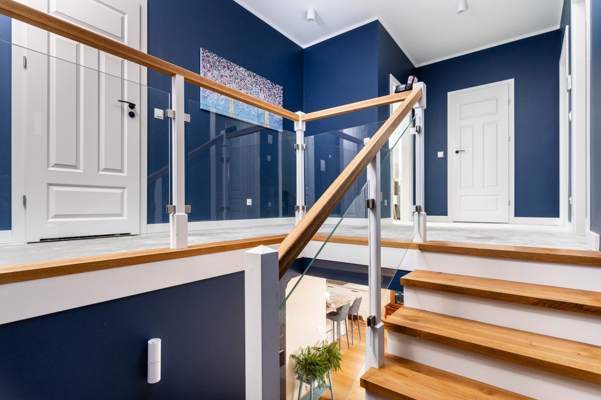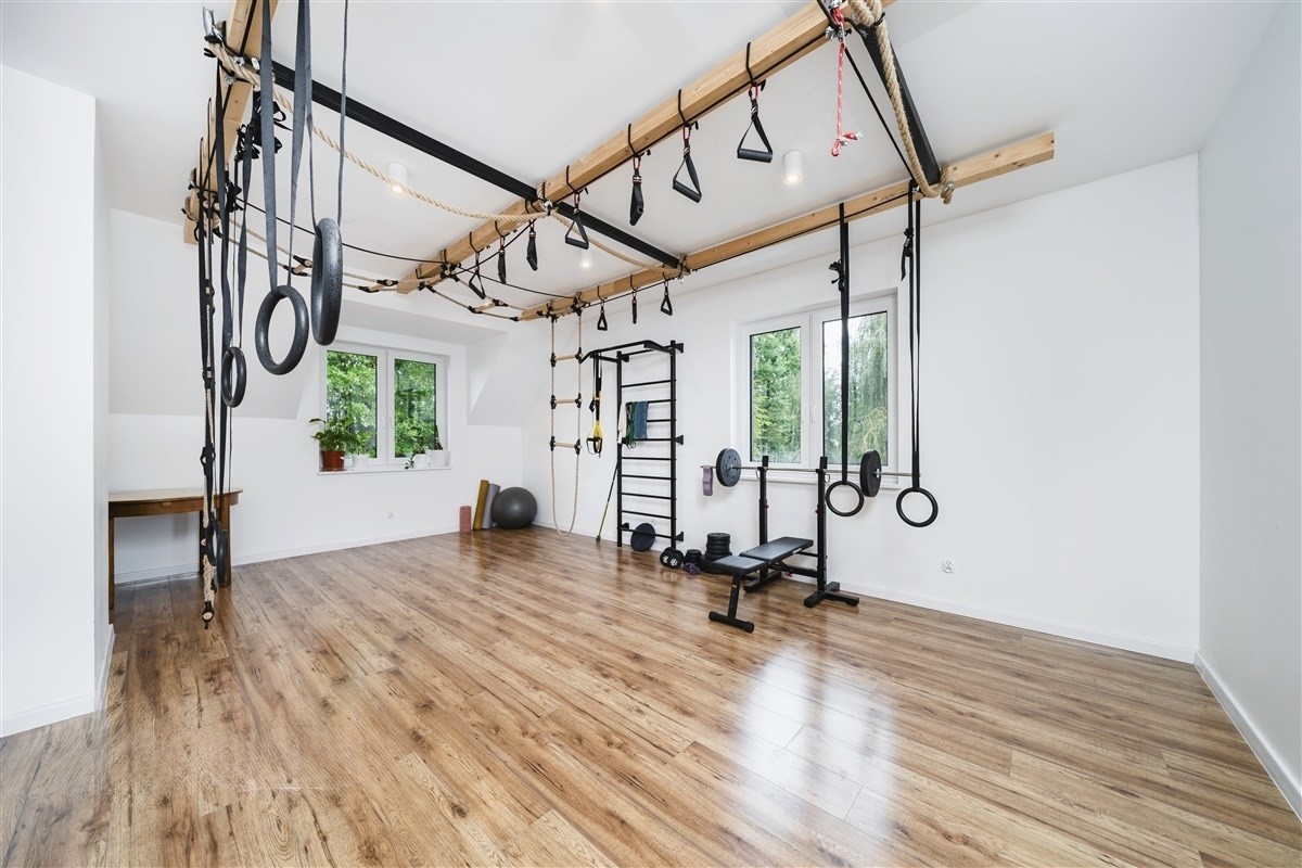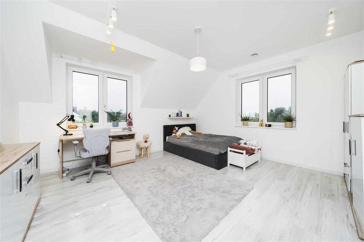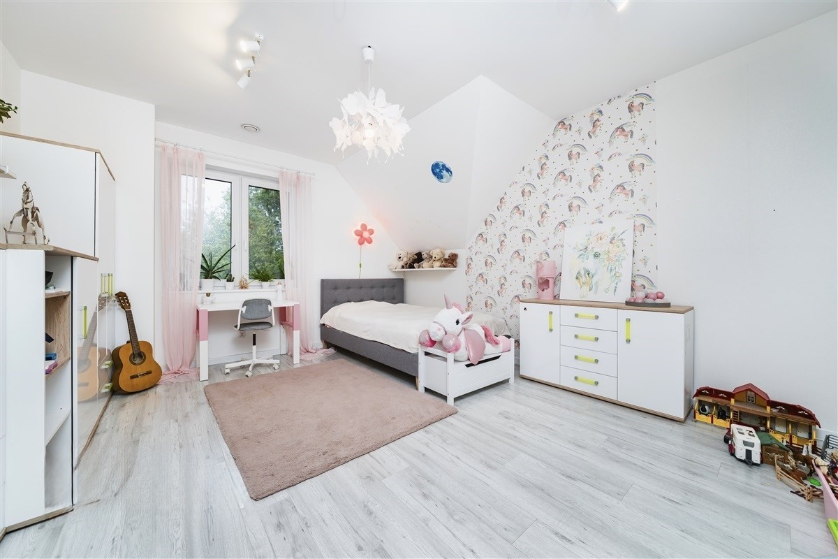 Na piętro prowadzą schody z drewna, z którego zrobiona jest podłoga na parterze z barierkami ze szkła. Na piętrze korytarz i główna sypialnia wyłożone są miękką wykładziną, a granatowe ściany pięknie kontrastują z białymi drzwiami, które są w tym samym stylu co drzwi wejściowe w całym domu. W sypialni głównej na ścianach są tapety w odcieniu leśnej zieleni, jest tam miejsce i na duże łóżko i kącik do czytania i biurko. W sypialni jest wejście do łazienki z prysznicem, toaletą i bidetem. Obok wejścia do sypialni znajduje się garderoba. Pokoje dzieci są duże, jasne i bardzo funkcjonalne, na podłogach są panele. Łazienka dzieci ma dwie umywalki, duży blat, wannę, toaletę i bidet. Na piętrze znajduje się również rekreacja, gdzie na suficie zamontowany został tor sprawnościowy z zabezpieczeniami do zabawy i dla dzieci i dla dorosłych. Jest tam również drabinka do ćwiczeń oraz sprzęty do ćwiczeń siłowych. Pralnia ma zamontowane półki do przechowywania środków czystości oraz wystarczają ilość miejsca do suszenia prania. Z korytarza na piętrze jest wejście na ogromny strych, z możliwością adaptacji.