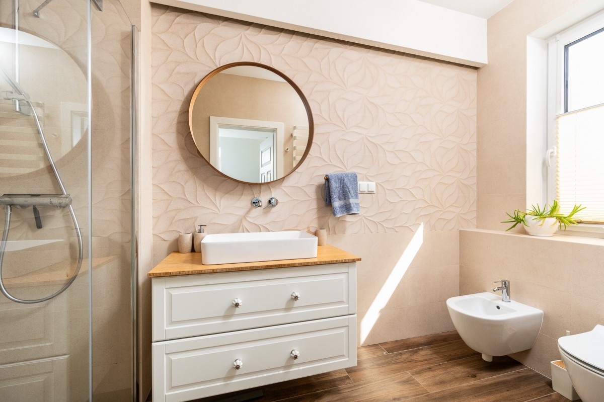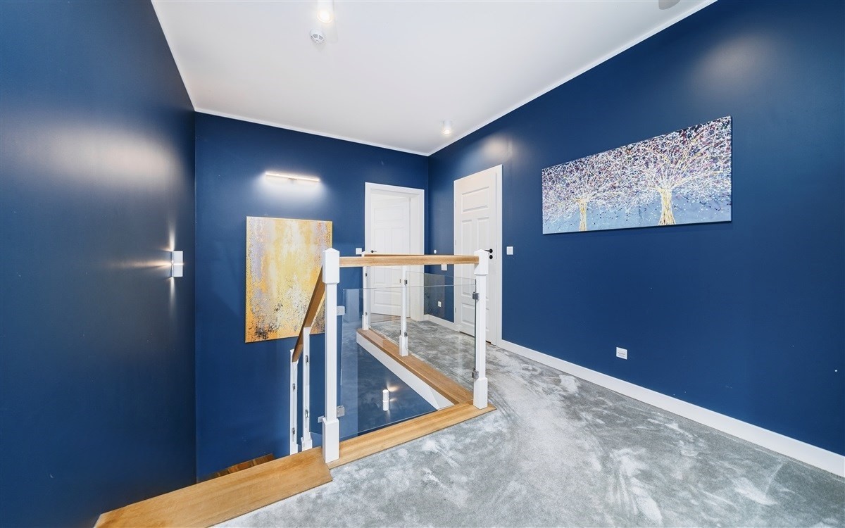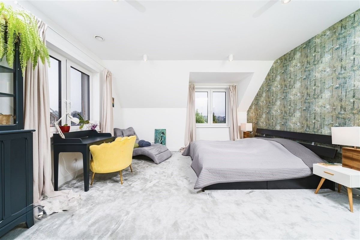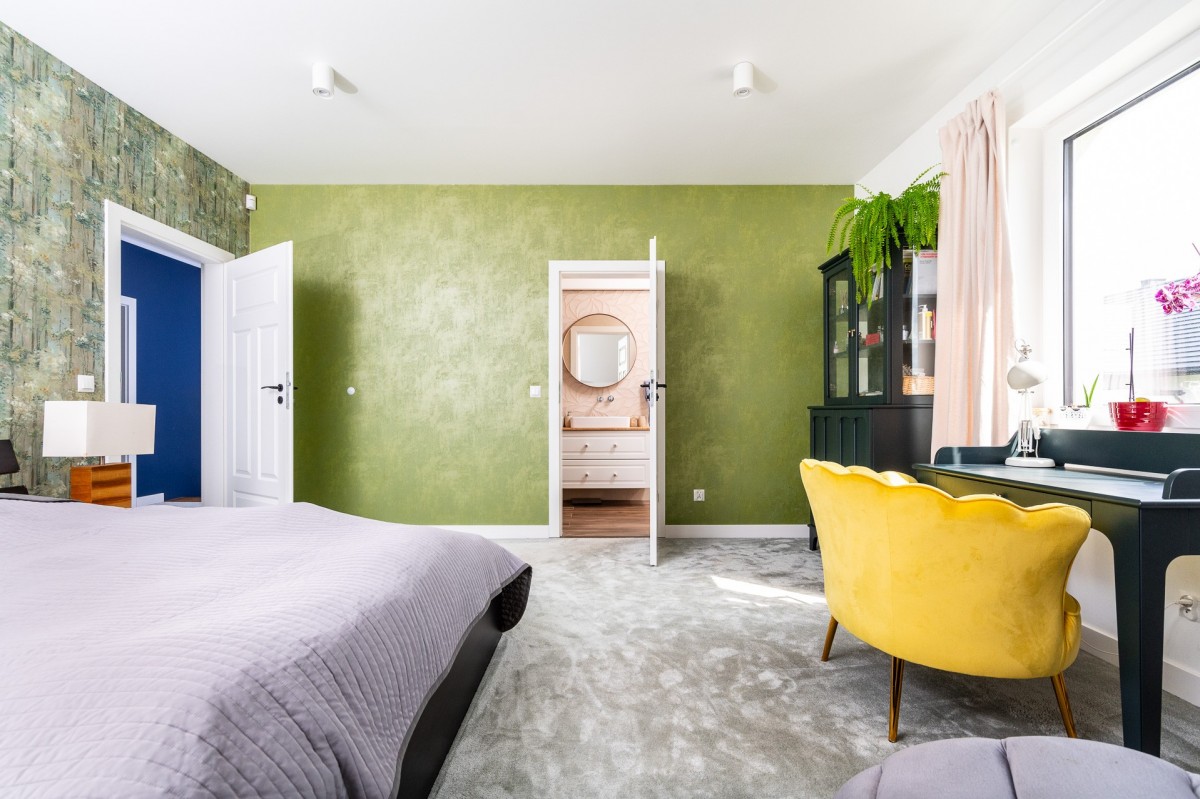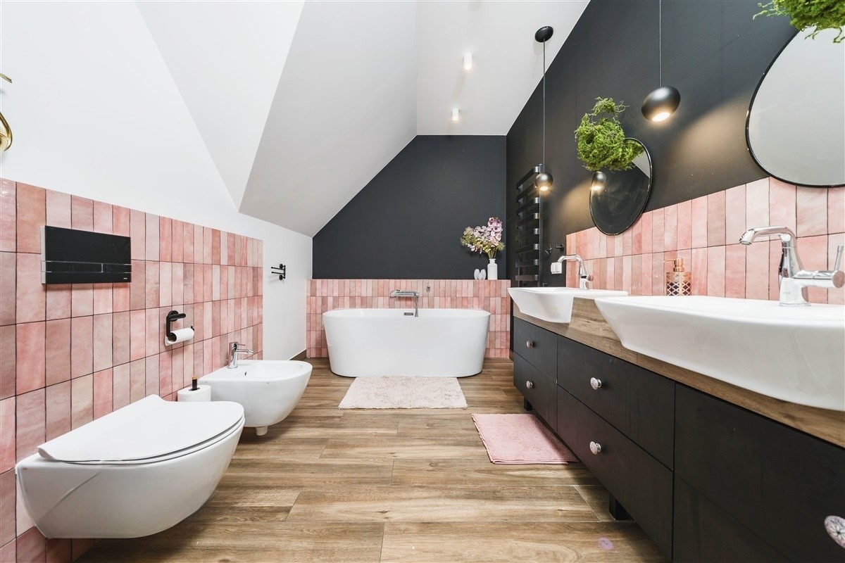 Na piętro prowadzą schody z drewna, z którego zrobiona jest podłoga na parterze z barierkami ze szkła. Na piętrze korytarz i główna sypialnia wyłożone są miękką wykładziną, a granatowe ściany pięknie kontrastują z białymi drzwiami, które są w tym samym stylu co drzwi wejściowe w całym domu. W sypialni głównej na ścianach są tapety w odcieniu leśnej zieleni, jest tam miejsce i na duże łóżko i kącik do czytania i biurko. W sypialni jest wejście do łazienki z prysznicem, toaletą i bidetem. Obok wejścia do sypialni znajduje się garderoba. Pokoje dzieci są duże, jasne i bardzo funkcjonalne, na podłogach są panele. Łazienka dzieci ma dwie umywalki, duży blat, wannę, toaletę i bidet. Na piętrze znajduje się również rekreacja, gdzie na suficie zamontowany został tor sprawnościowy z zabezpieczeniami do zabawy i dla dzieci i dla dorosłych. Jest tam również drabinka do ćwiczeń oraz sprzęty do ćwiczeń siłowych. Pralnia ma zamontowane półki do przechowywania środków czystości oraz wystarczają ilość miejsca do suszenia prania. Z korytarza na piętrze jest wejście na ogromny strych, z możliwością adaptacji.