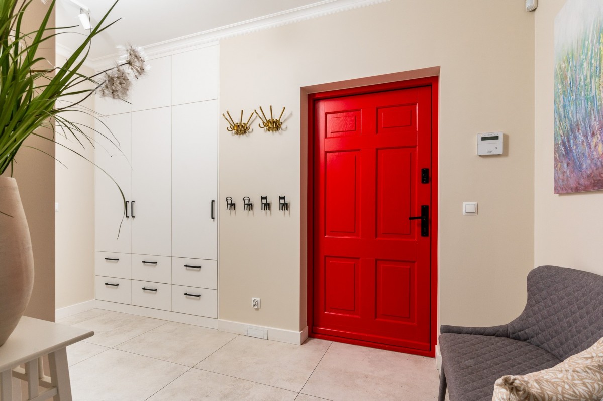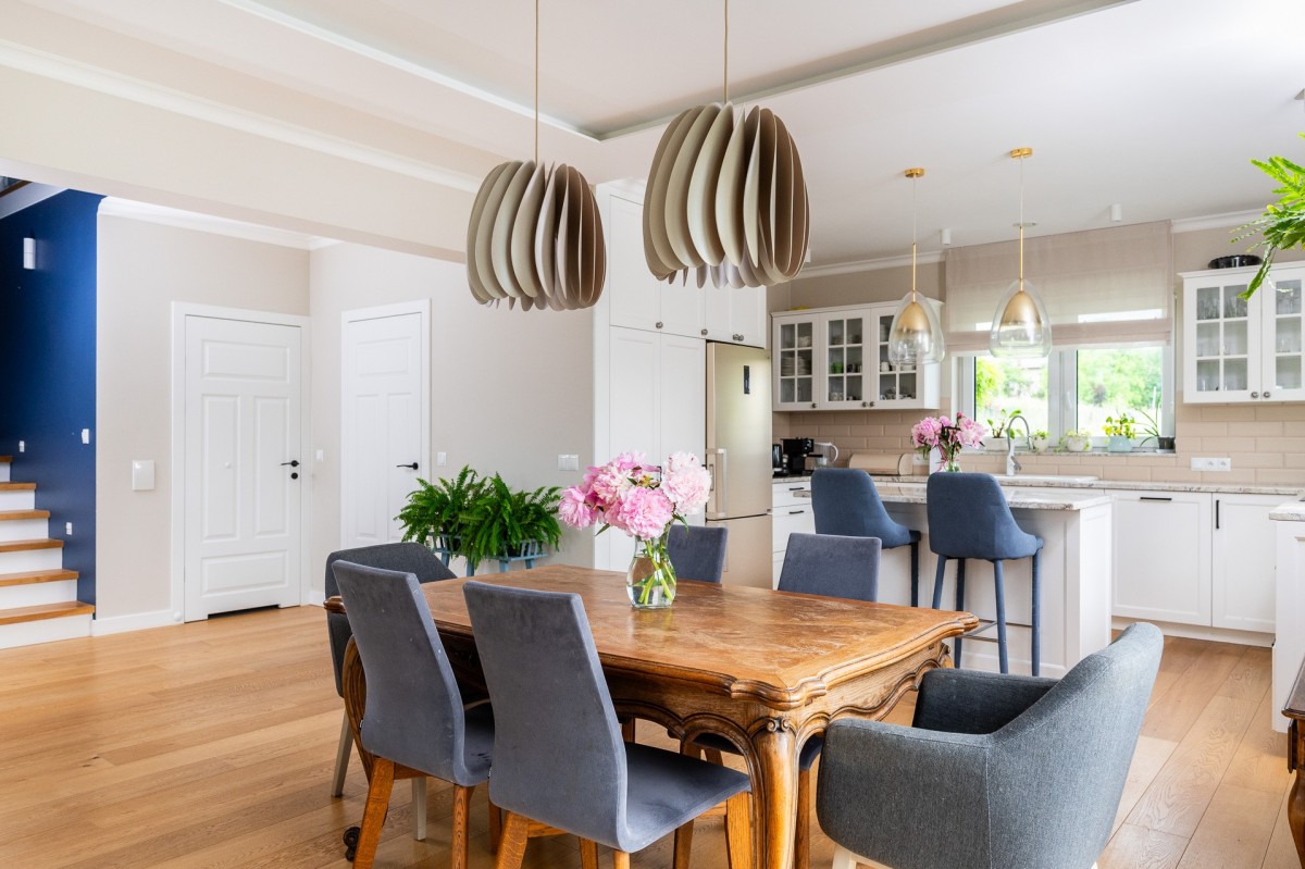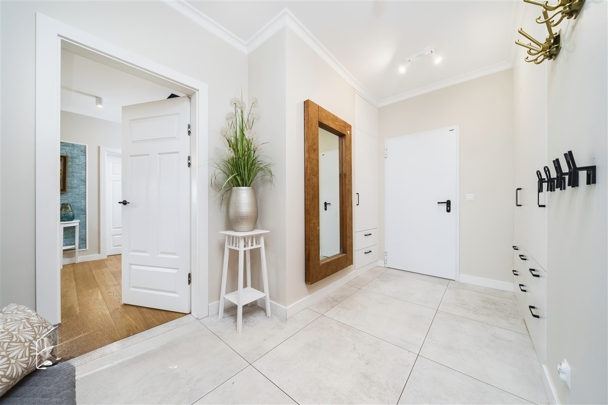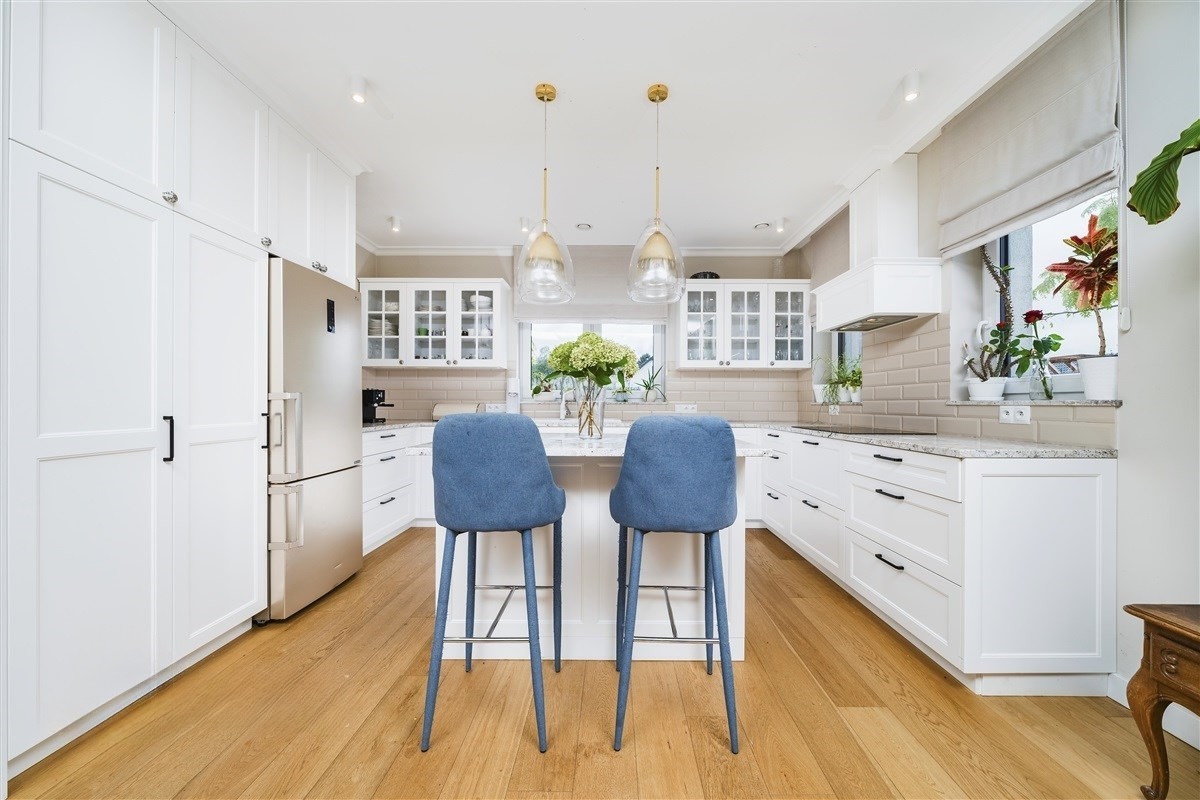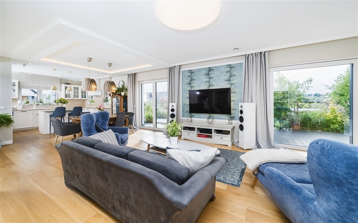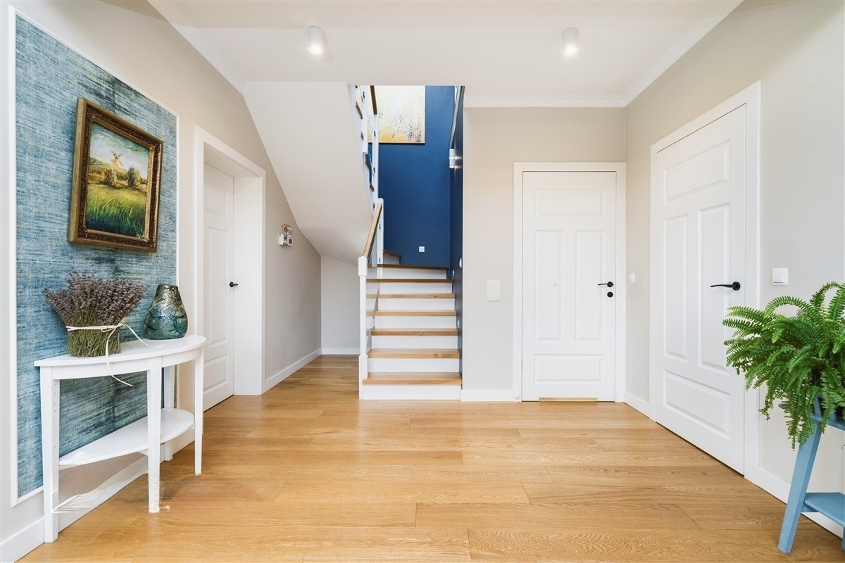 Do domu zapraszają czerwone drewniane drzwi kasetonowe, a wita duży, przestronny wiatrołap z wielkimi szafami i dużą szafka na buty. Dalej wchodzimy do przestrzeni otwartej, która została podzielona na strefę jadalni z wyjściem na taras, salon z kominkiem i kuchnię. Na podłodze położona jest dębowa podłoga z niewielkiej krakowskiej manufaktury. Ściany mają neutralne kolory, uzupełnione delikatną sztukaterią, która nadaje ponadczasowej elegancji. Od strony południowo - zachodniej znajduje się okno widokowe z systemem HS, którym wychodzimy na taras o powierzchni ok 50m2. W kuchni meble zostały wykonane na wymiar z systemami firmy Bloom, jest 5-cio stanowiskowa płyta indukcyjna, okap, piekarnik, zmywarka i duża, pojemna lodówka. Meble przykrywa 10mb blatu granitowego. Na parterze znajduje się też ustawny gabinet z widokiem na dęby i staw, łazienka dla gości z prysznicem i toaletą oraz przejście z wiatrołapu do obszernego garażu z dużą ilością miejsca dla sprzętów i samochodu. W kotłowni poza sprzętami jest rownież wanna do mycia zwierzaków i sprzętu. Zarówno drzwi wejściowe jak i pomiędzy garażem i wnętrzem domu oraz wyjściowe z kotłowni są antywłamaniowe.