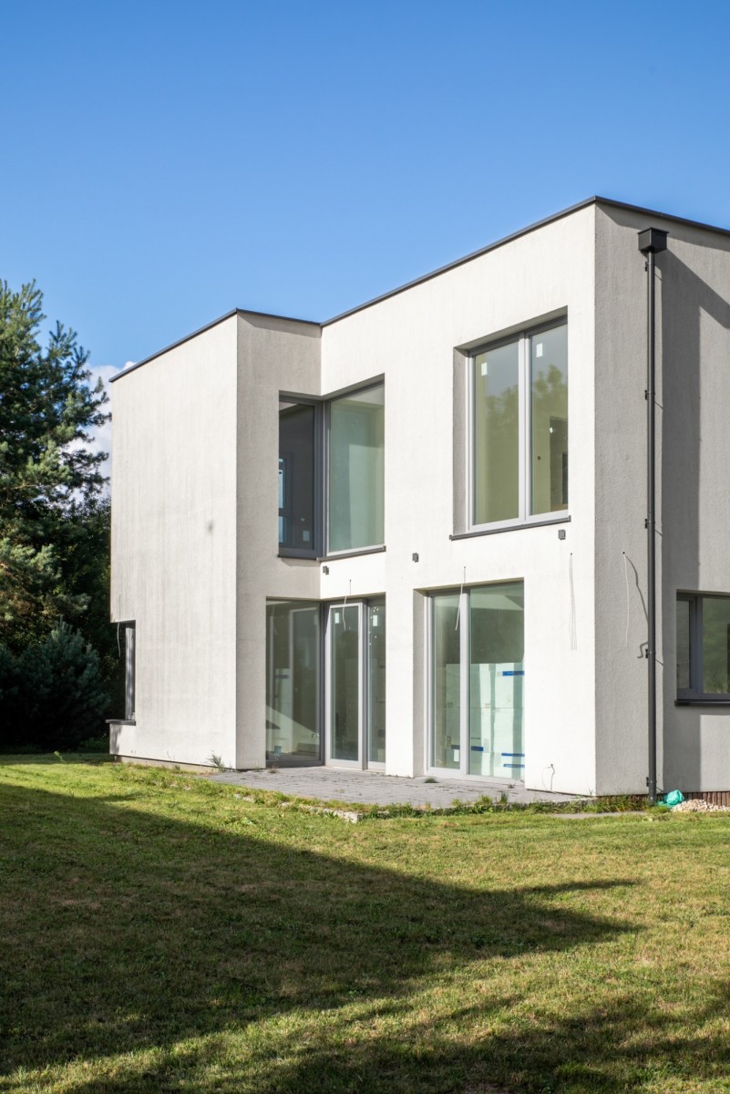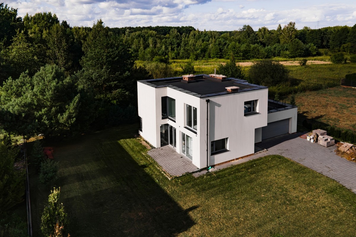 Dom wyróżnia się nowoczesną, przemyślaną bryłą i dużą ilością przeszkleń, które zapewniają doskonałe doświetlenie wnętrz przez cały dzień. Duże okna nie tylko wprowadzają do środka naturalne światło, ale również otwierają przestrzeń na otoczenie i ogród. Z przestronny taras na piętrze zaprasza do pracy zdalnej, delektując się widokiem na las i otwartą przestrzeń łąk, na których znajdują się siedliska lęgowe ptaków.