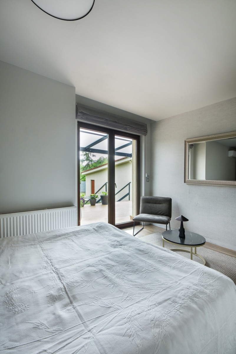 - główna sypialnia na parterze z klimatyzacją, własną łazienką i pomieszczeniem zaaranżowanym na garderobę. Dodatkowo z sypialni wyjście na taras,