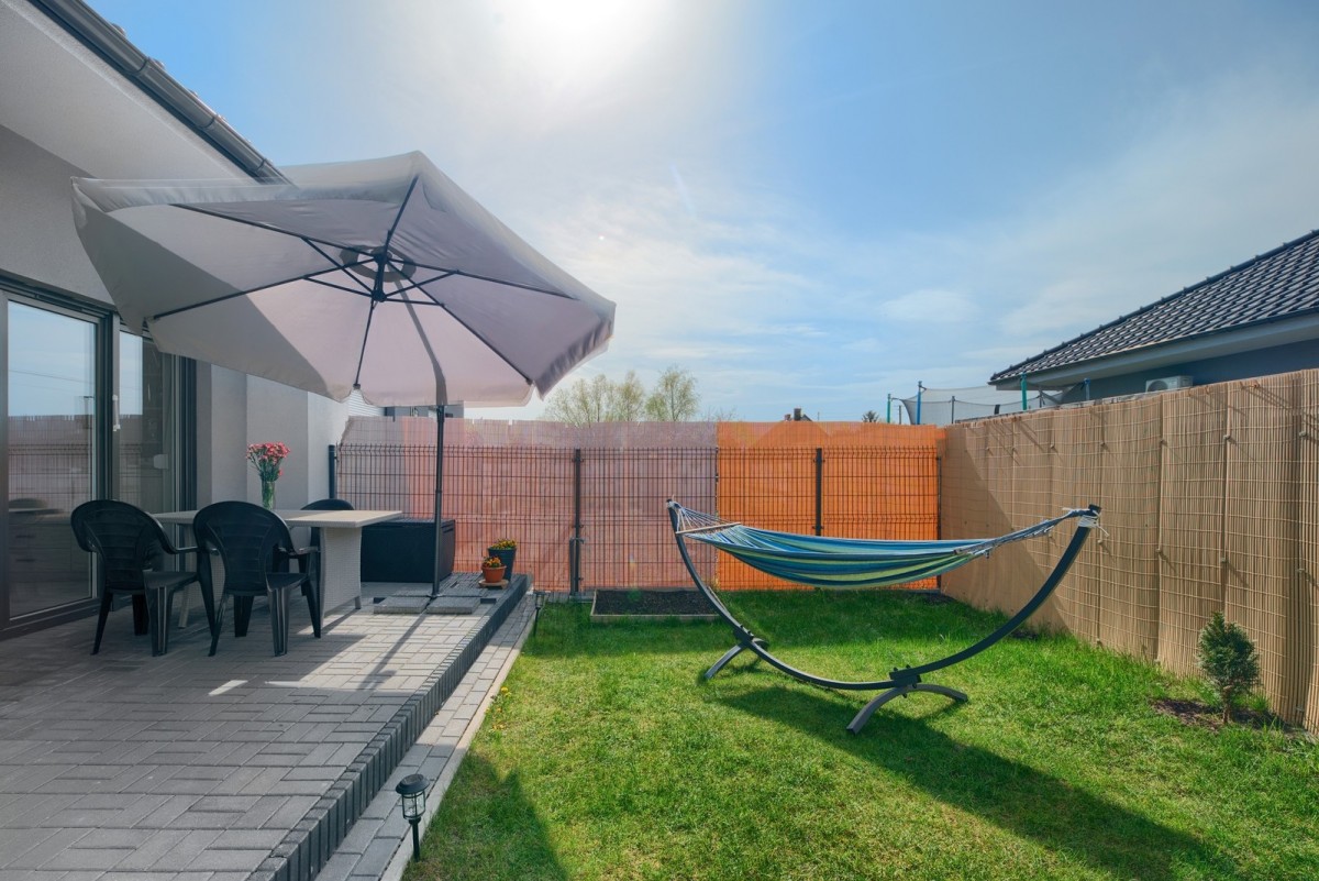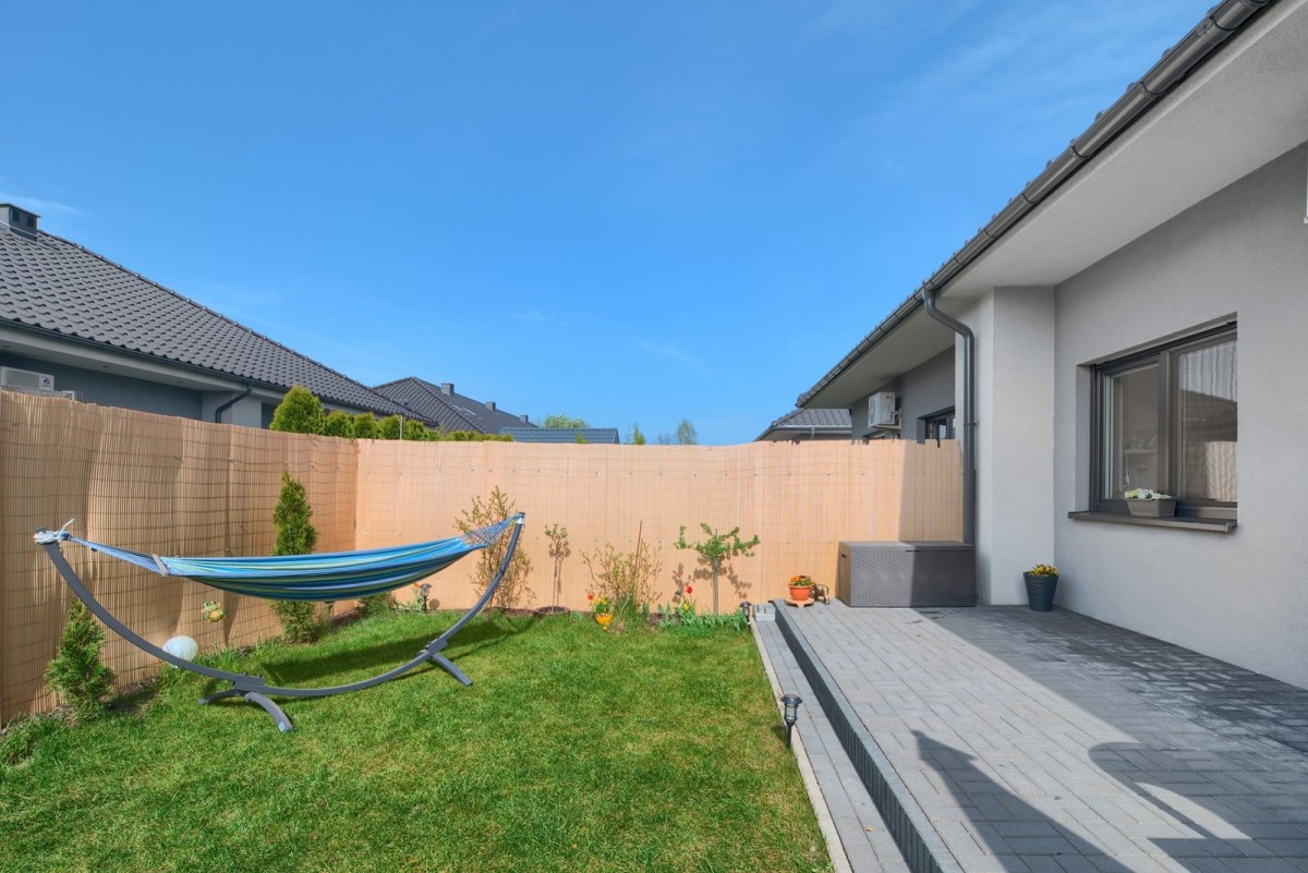 Na froncie działki (wyłożonym kostką brukową) jest miejsce do zaparkowania dwóch samochodów. Jej część wypoczynkowo-ogrodowa ma powierzchnię ~ 50 m2.