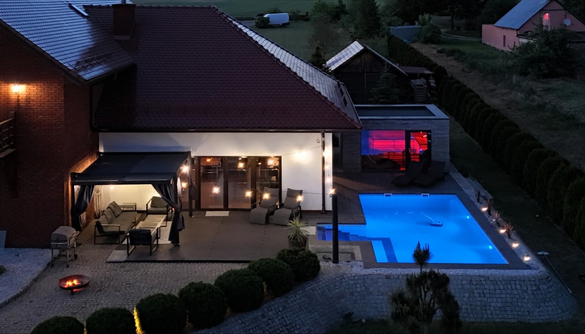 Wieczorem po kąpieli w basenie odprężasz się w saunie, a następnie wypoczywasz w przytulnym salonie z kominkiem.