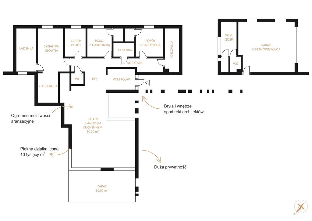 Dom parterowy o powierzchni mieszkalnej 246 m² z dużym garażem i zapleczem gospodarczym, zaprojektowany przez pracownię Grupa YANG Architekci, przez mgr inż. arch. Michała Jabłońskiego - pracownia jest laureatem prestiżowej nagrody Orły Architektury Gold 2025