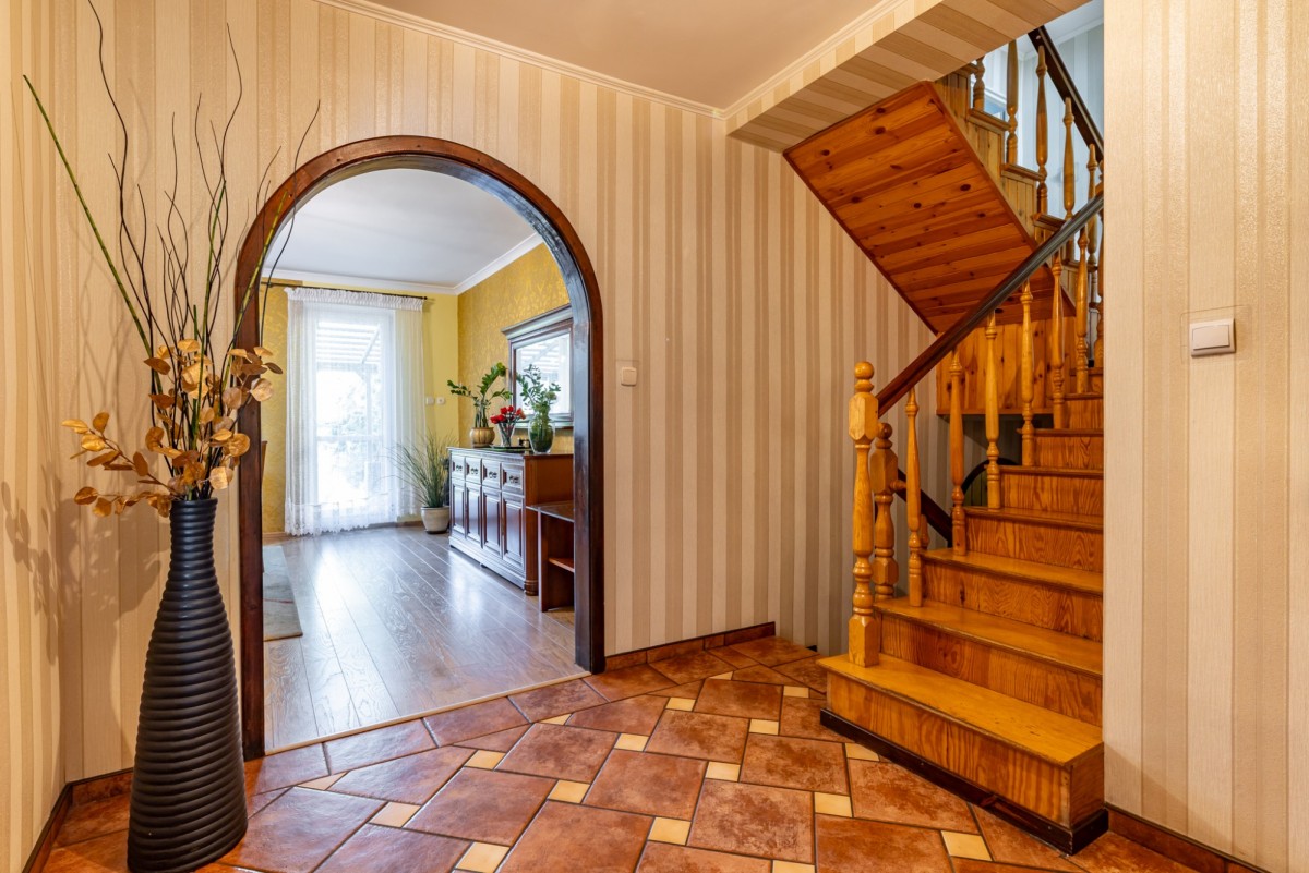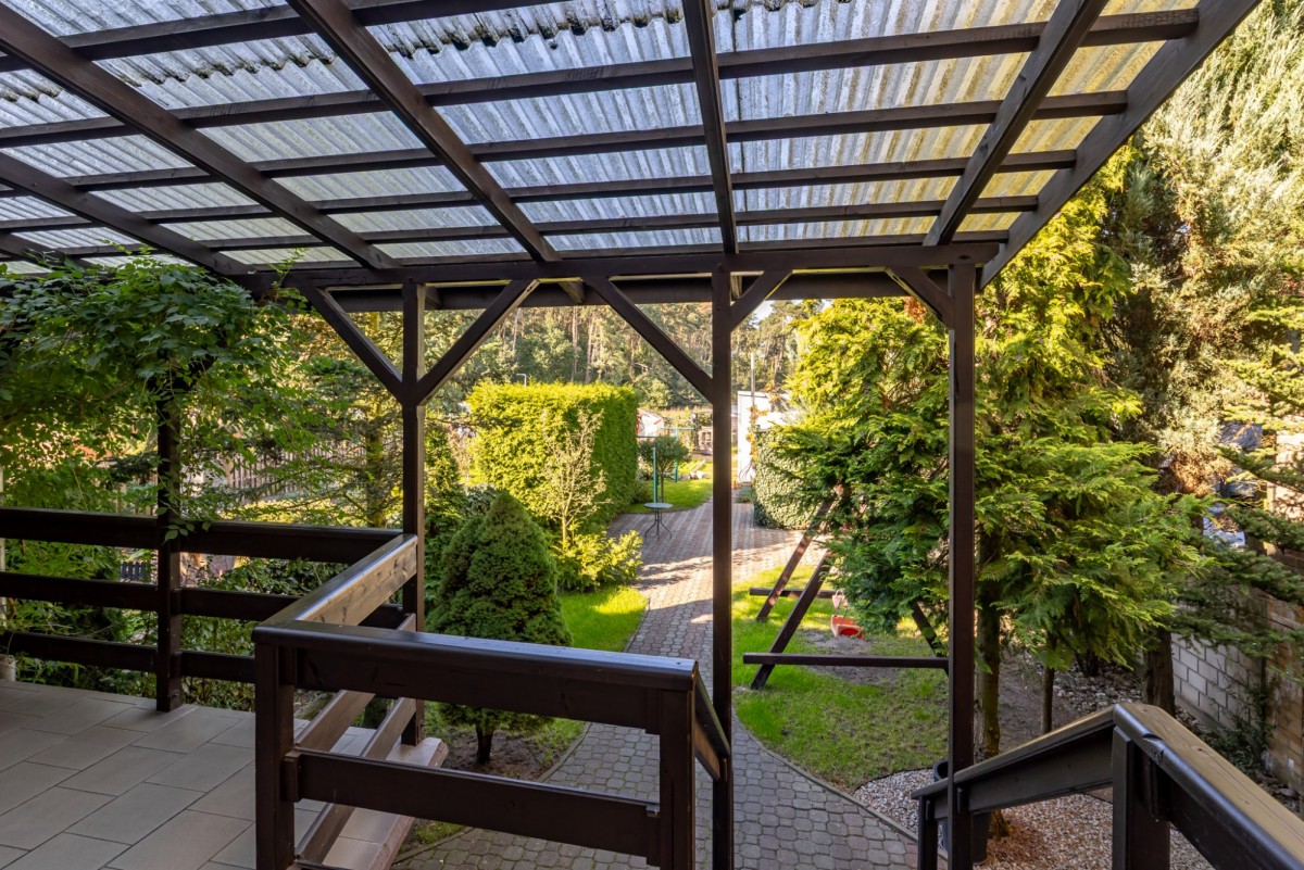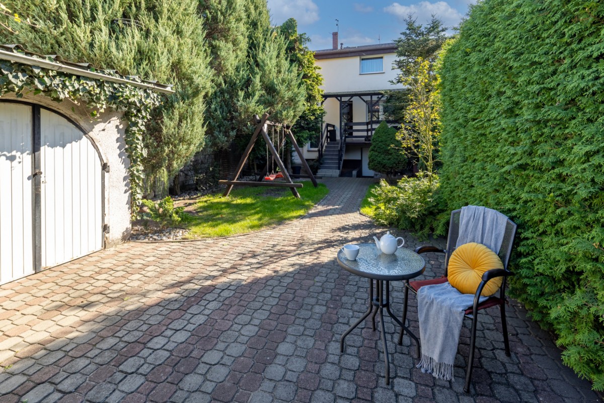 - Dodatkowe wejścia do domu (od strony ogrodu) oraz oddzielny wjazd z dużą bramą zwiększają funkcjonalność posesji.