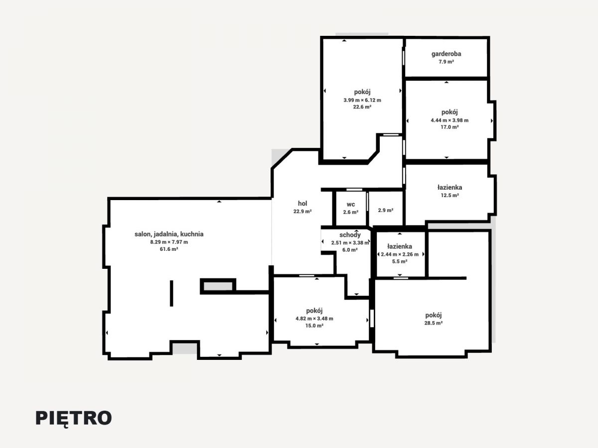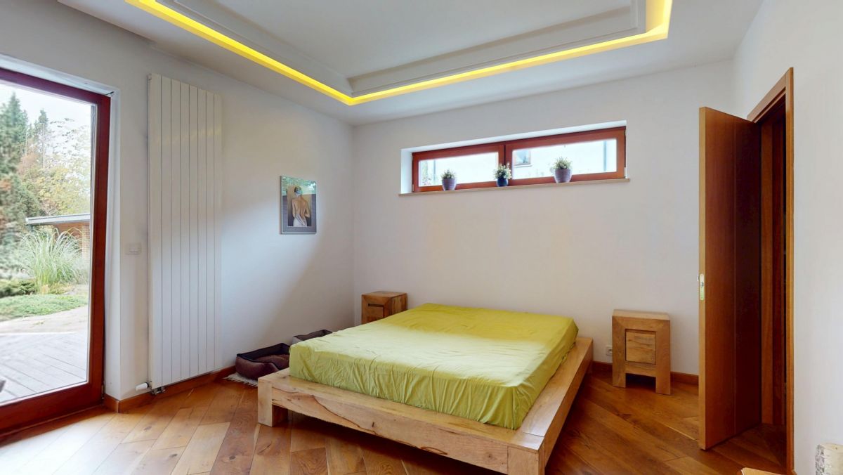 • piętro: salon z kuchnią i jadalnią, sypialnię z garderobą, gabinet, ogromny pokój z własną sypialnią i łazienką