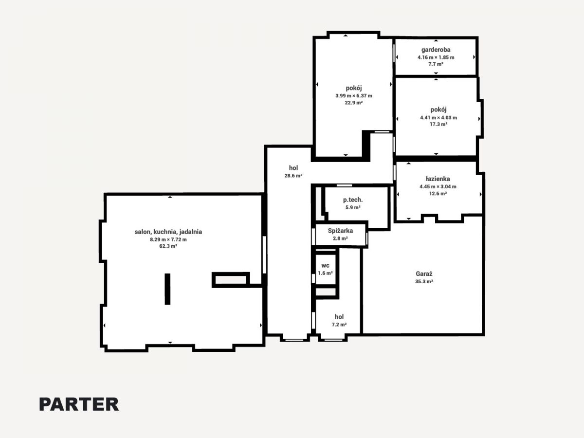 • parter: salon z kuchnią i jadalnią, sypialnię z garderobą, gabinet, łazienkę, toaletę, spiżarnię, garaż