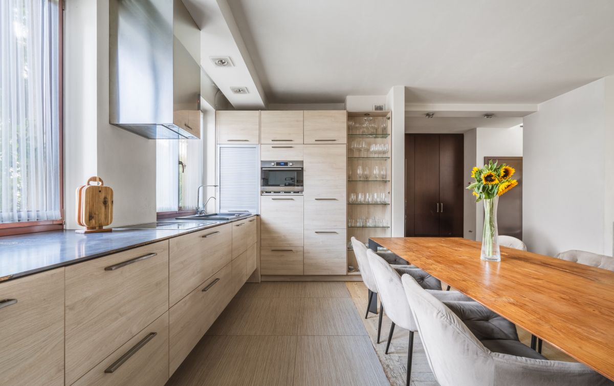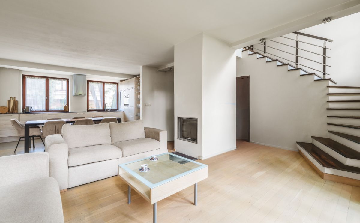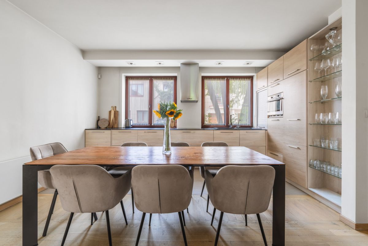 - Przestronny salon z jadalnią i kuchnią (39,2 m²), z bezpośrednim wyjściem na taras i do ogrodu. Ogromne okna zapewniają doświetlenie przez cały dzień,