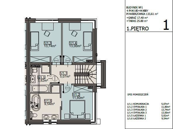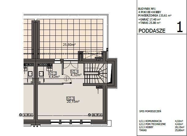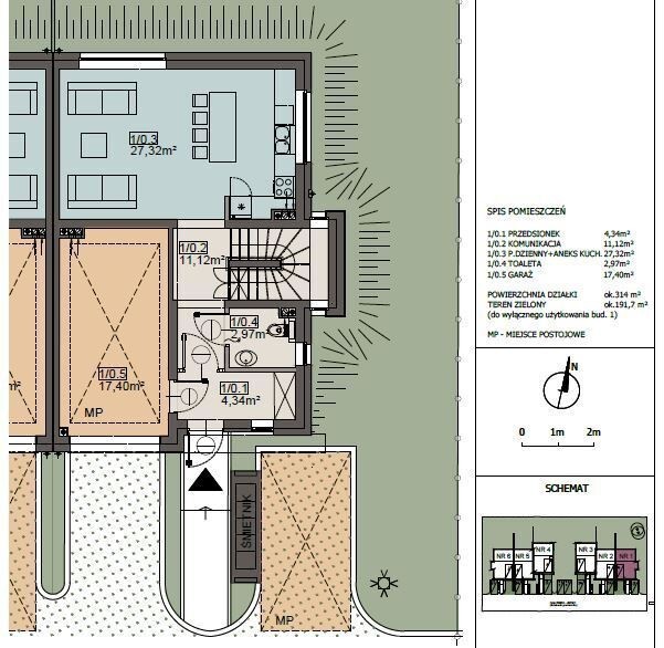 Dom o powierzchni użytkowej 133,61 m², z garażem jednostanowiskowym (17,4 m²) oraz tarasem (25,8 m²), położony jest na narożnej działce o powierzchni 314 m², z przestronnym ogrodem 191,7 m².