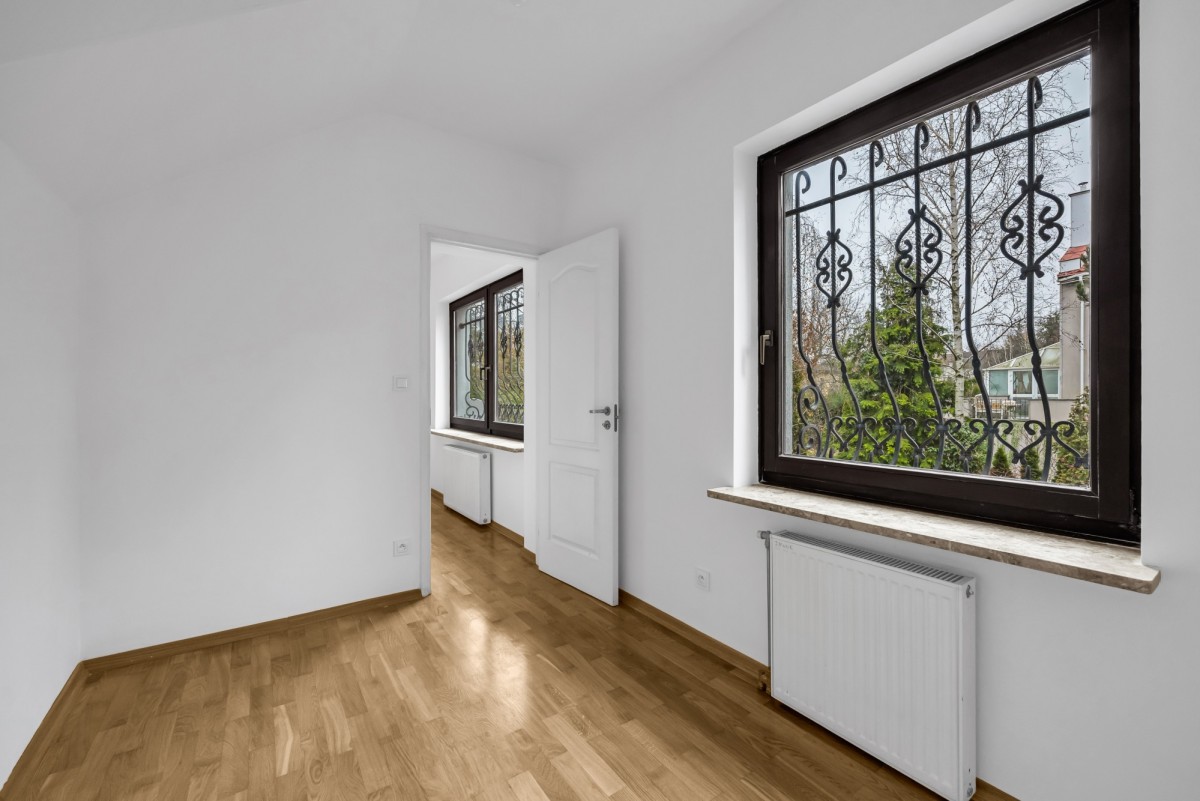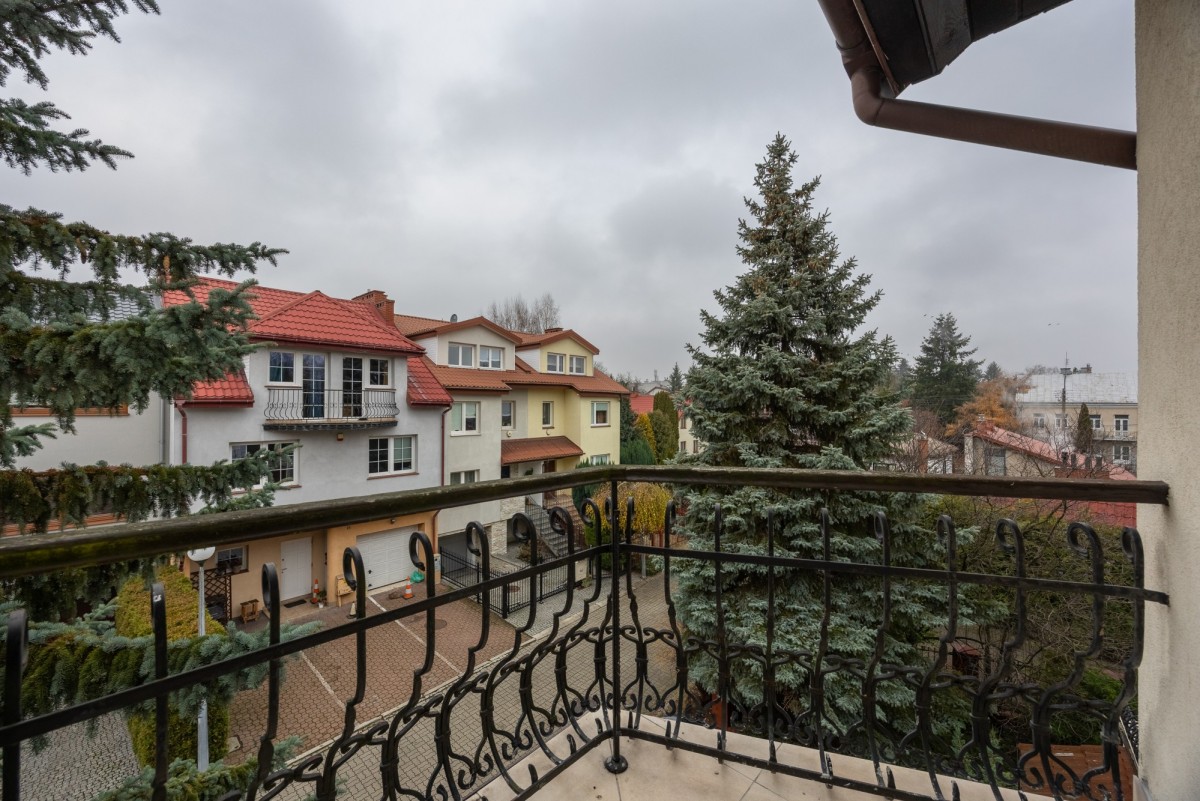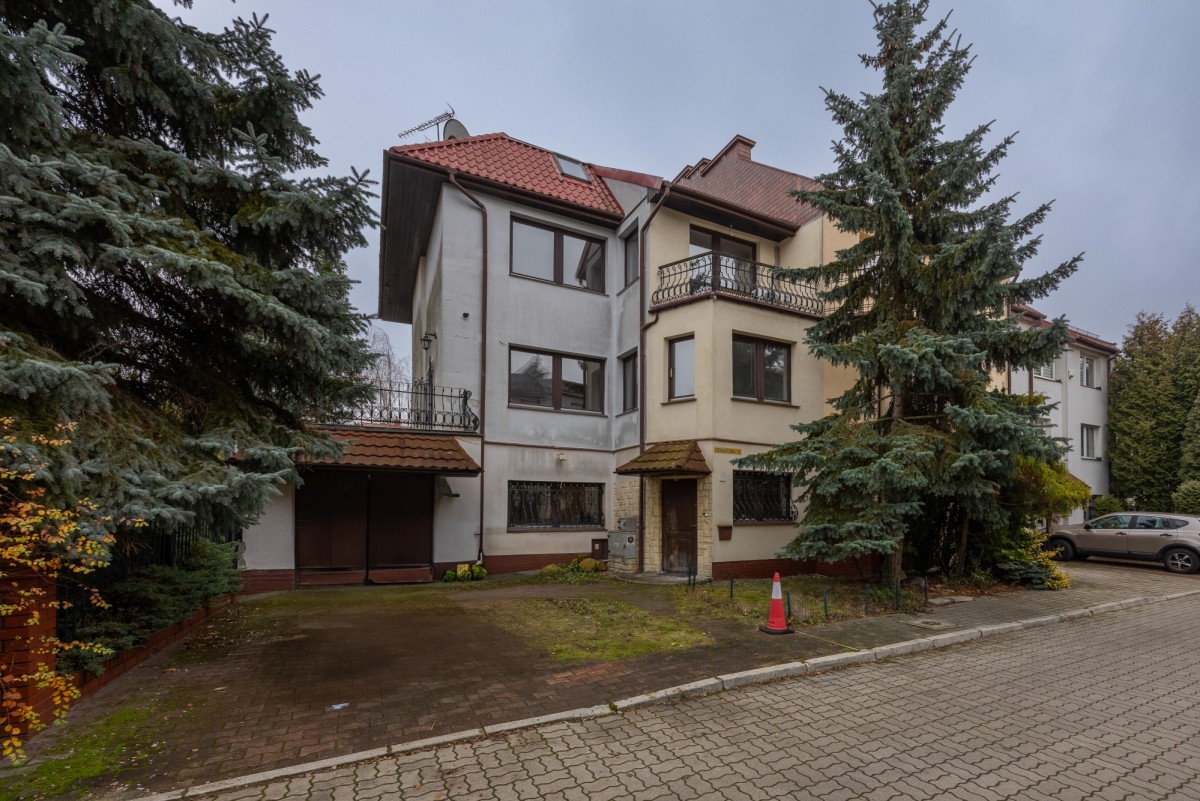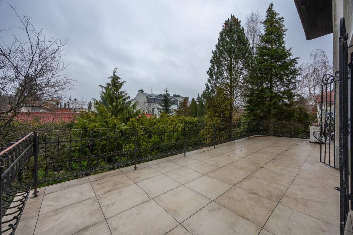 4 kondygnacje, garaż na 2 samochody + 2 miejsca parkingowe. Duży, słoneczny taras, ogródek, ogrodzenie z kutego metalu i cegły klinkierowej.