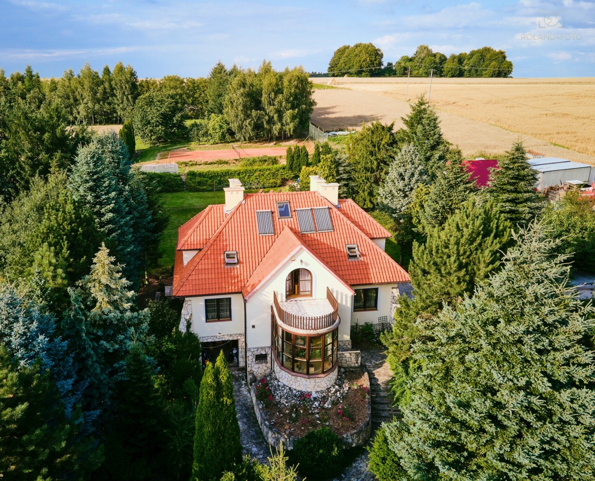 Przestronna rezydencja o powierzchni całkowitej 356 m² (użytkowa 218 m²) zachwyca od pierwszego spojrzenia. Klasyczny styl dworkowy z kolumnowym wejściem, dachem pokrytym ceramiczną dachówką i brązowymi, drewnianymi oknami wprowadza niepowtarzalny klimat. Charakteru owej nieruchomości dodaje absyda, w której znajduje się ogród zimowy.
