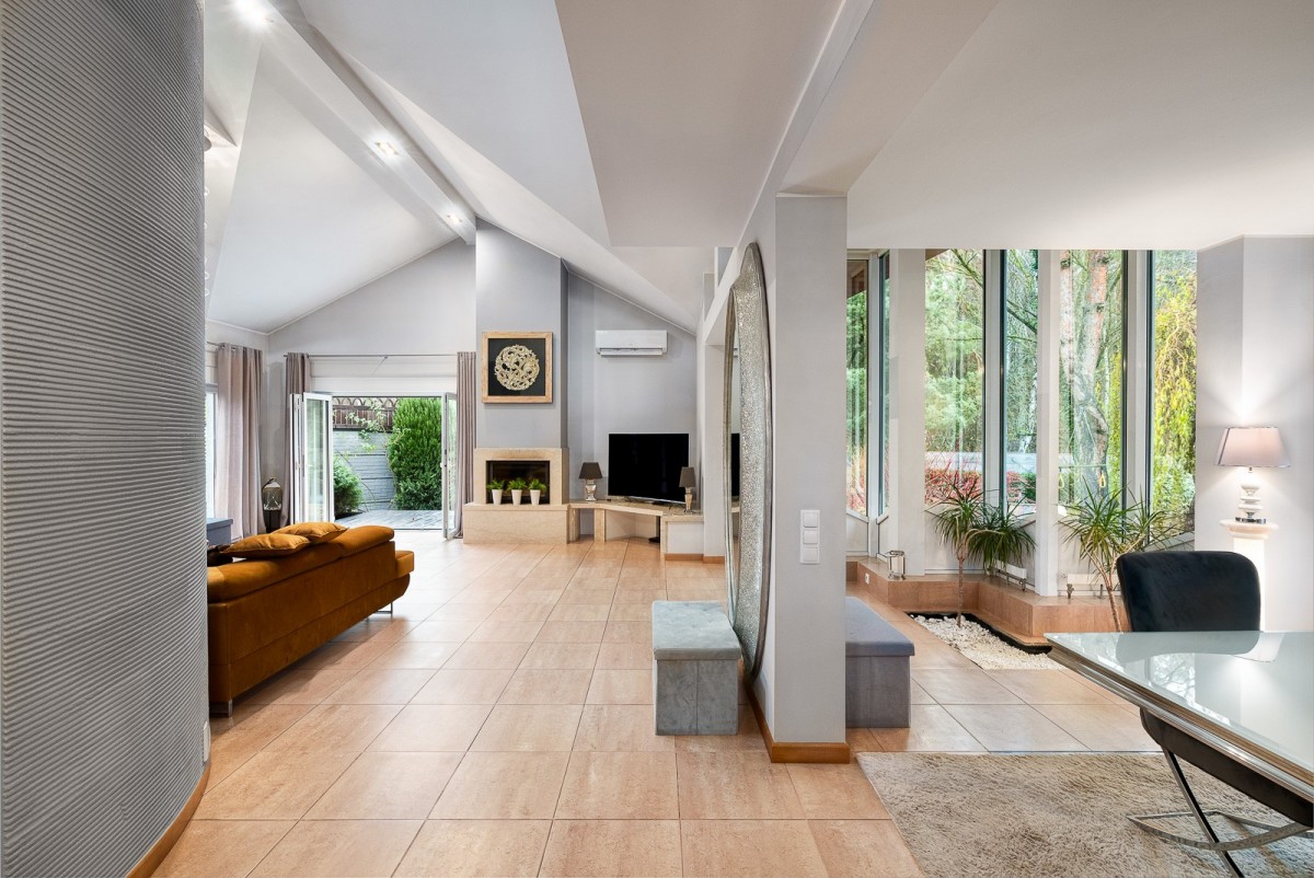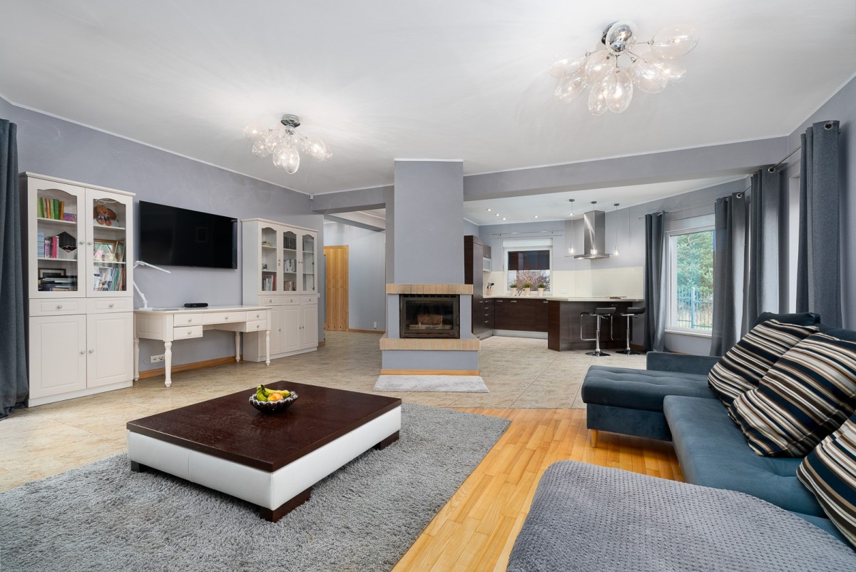 - duży salon z centralnie umieszczonym kominkiem oraz otwartą kuchnią