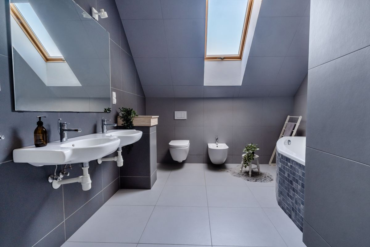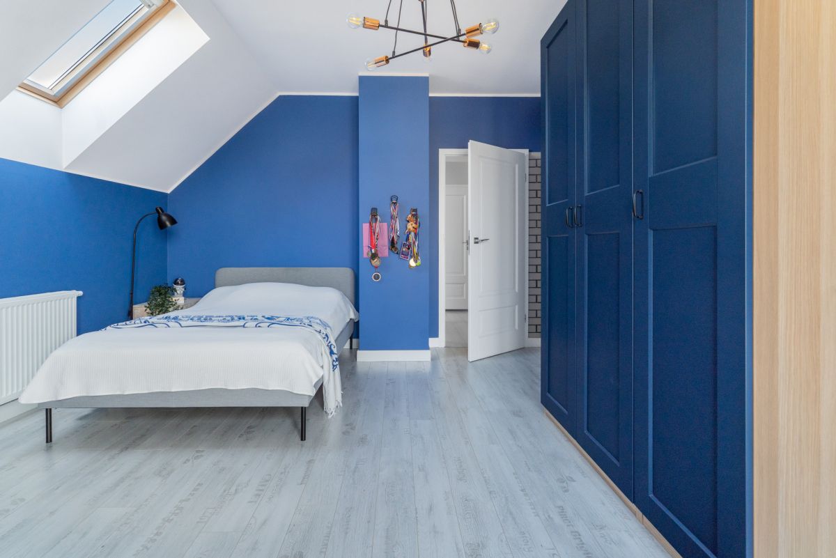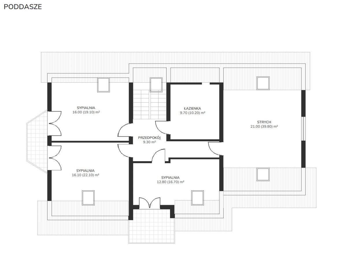 Dom główny (218 m²) to przemyślana przestrzeń rodzinna. Na parterze znajduje się salon z aneksem kuchennym i spiżarnią, jadalnia w wykuszu oraz łazienka z prysznicem i pralnia. Piętro mieści trzy ustawne sypialnie, łazienkę z wanną oraz wielofunkcyjny pokój nad garażem, który sprawdzi się jako siłownia, sala gier lub domowe biuro.