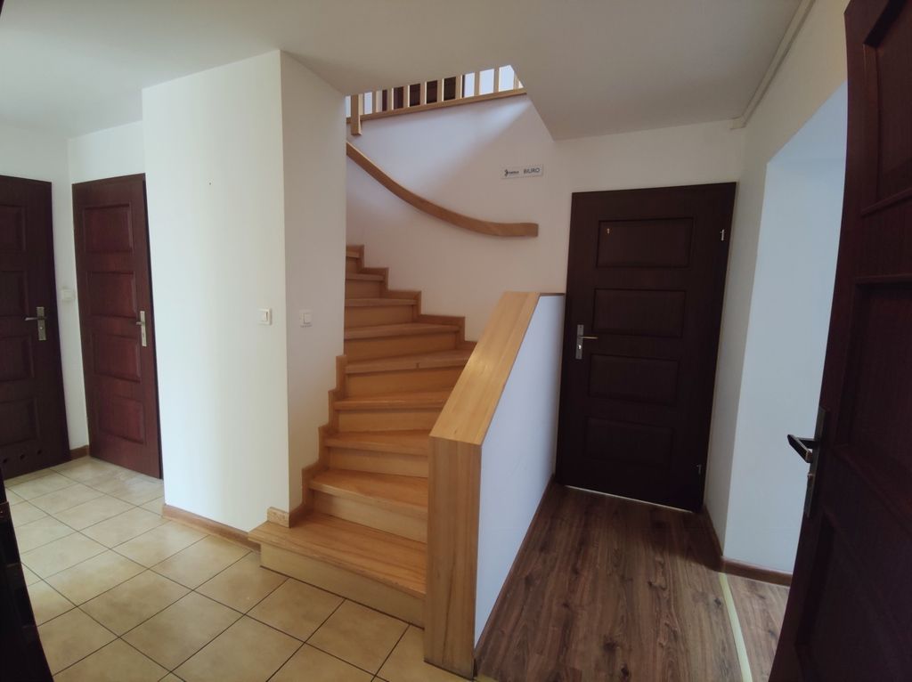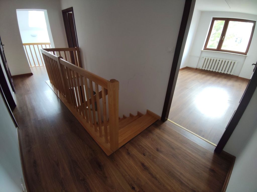W pokojach na podłogach panele, w kuchni i łazienkach terakota. Schody drewniane.