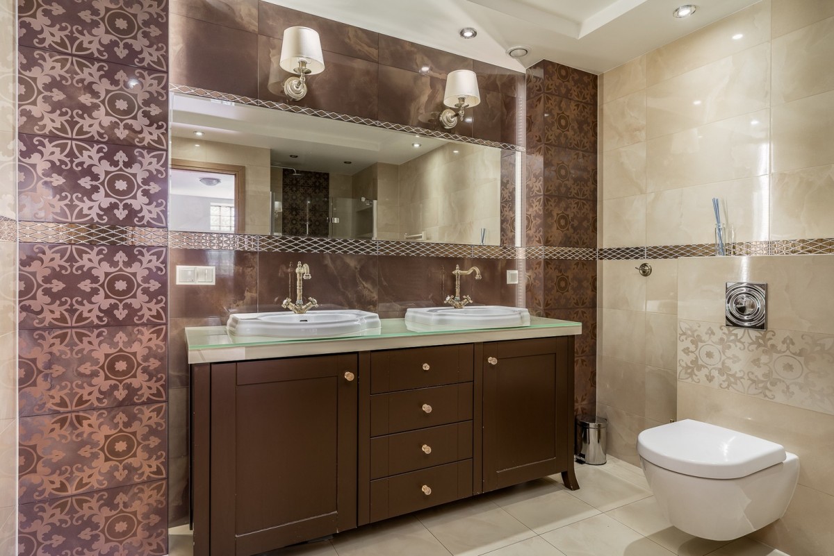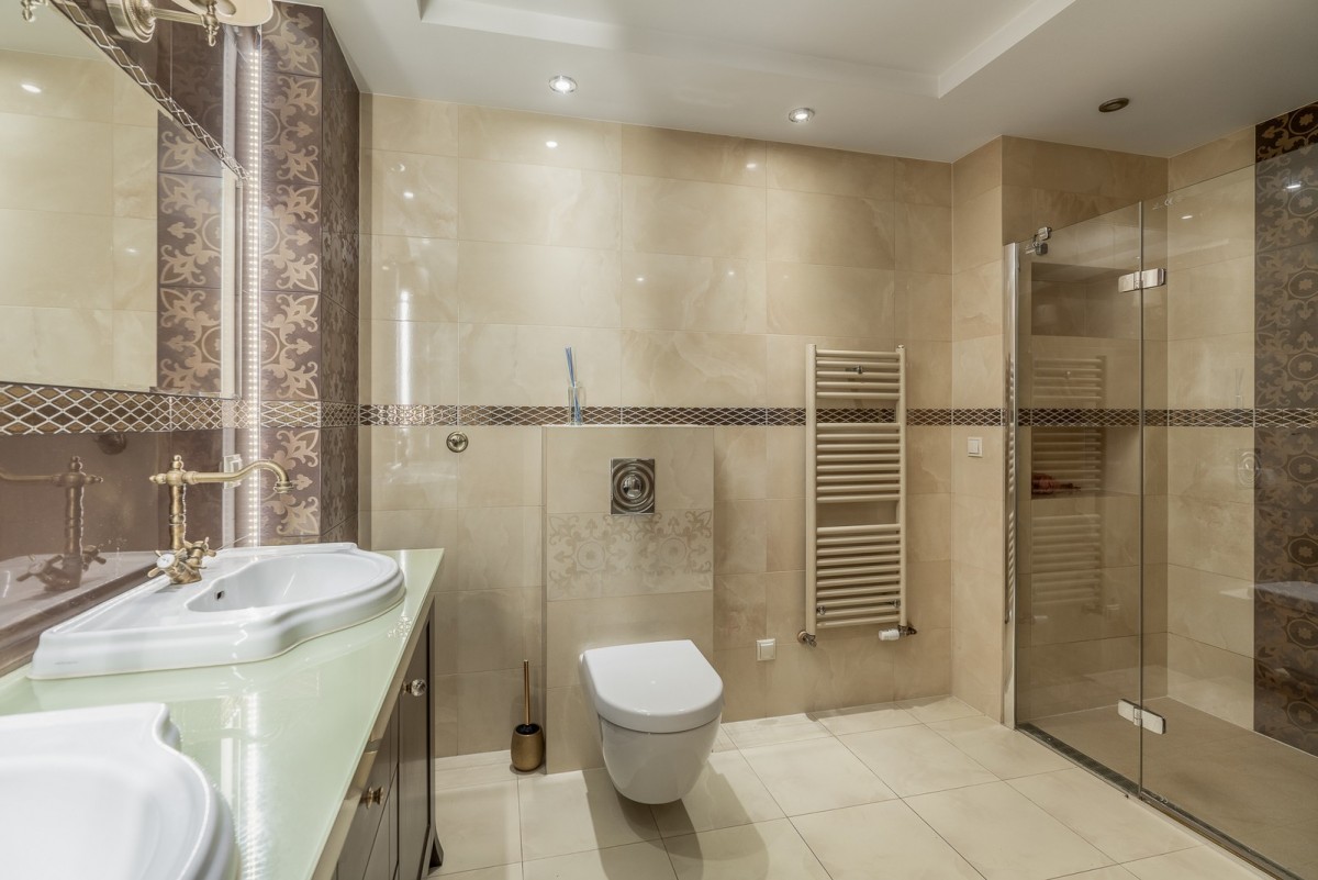 - łazienka z dużym prysznicem i dwoma umywalkami.