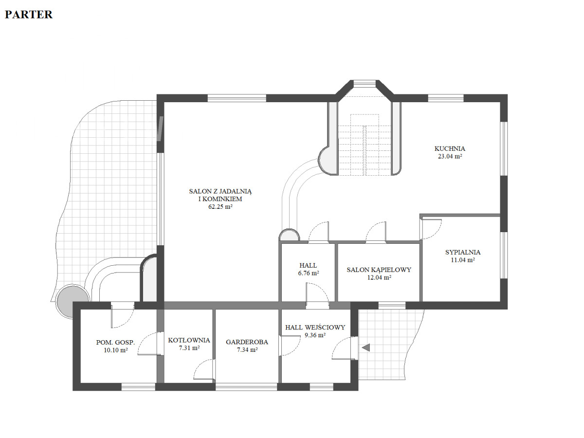- salon z jadalnią i kominkiem o powierzchni: 65,25 m2