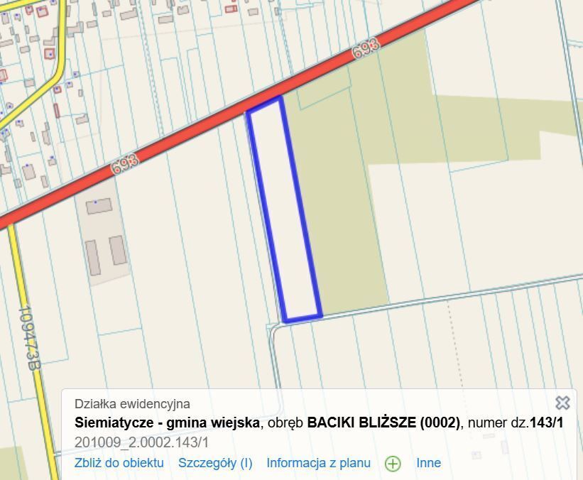 Na sprzedaż nieruchomość gruntowa niezabudowana stanowiąca działkę ewidencyjną nr.143/1 o łącznej powierzchni 1,65 ha ( szer. ok 52m i dł 317m ) zlokalizowana w obrębie nr. 0002 Baciki Bliższe gm. Siemiatycze